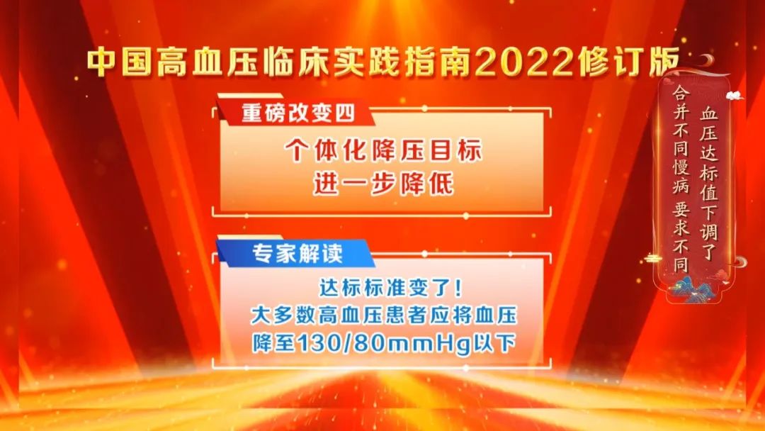 在2022年11月13日之前,大多数高血压患者的达标值是140/90毫米汞柱,而高龄老人可以放宽至高压150毫米汞柱,但是按照最新指南,不仅达标标准下调了,合并不同慢病和并发症的高血压患者,也将迎来新的个体化控压要求。那么如何跟上最新标准、实现又快又稳地控压呢?请继续关注由阜外医院蔡军、北京安贞医院赵冬两位教授共同主讲的《最新指南从严治“压”》 ,跟着本期节目对照一下自己的情况。