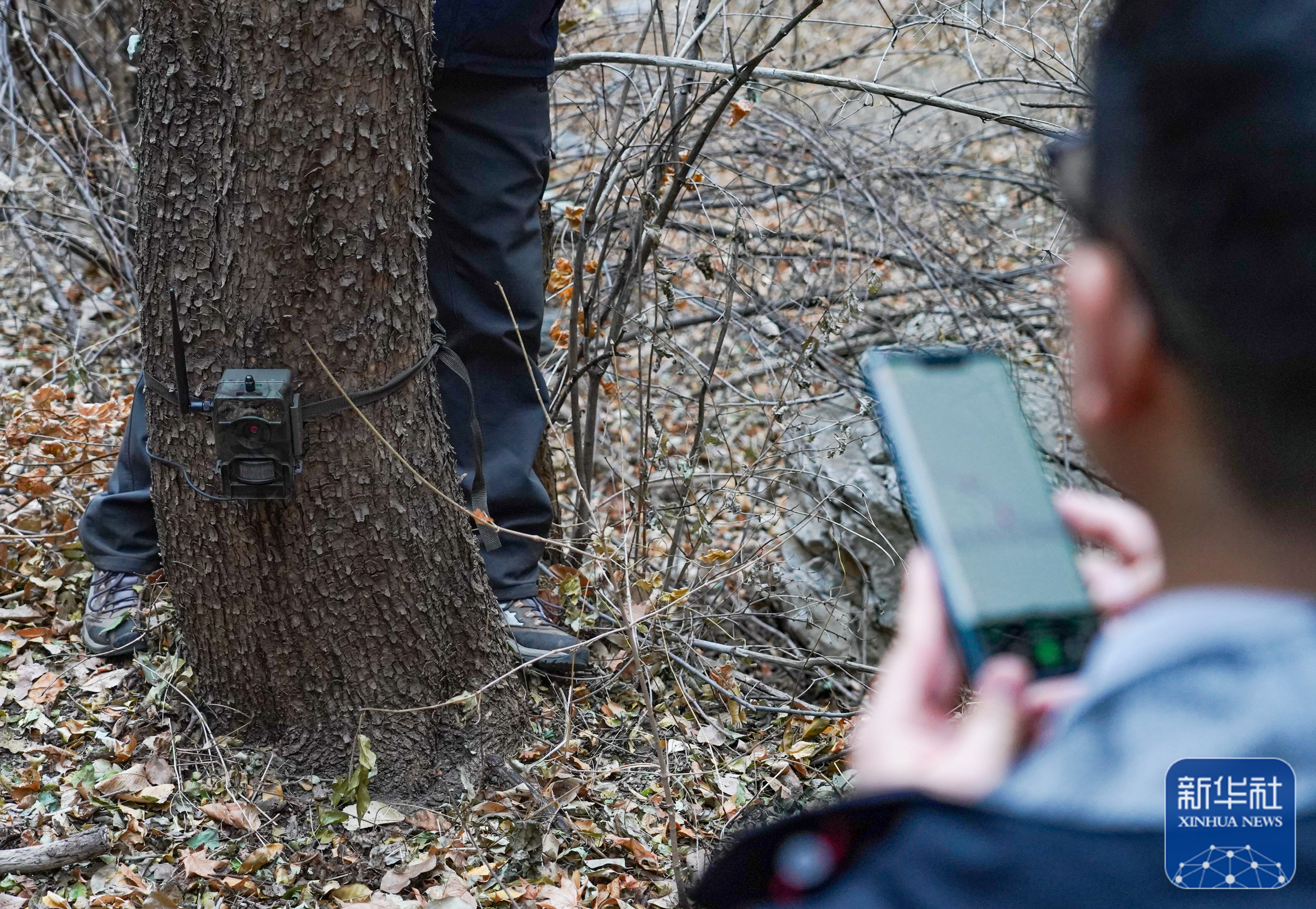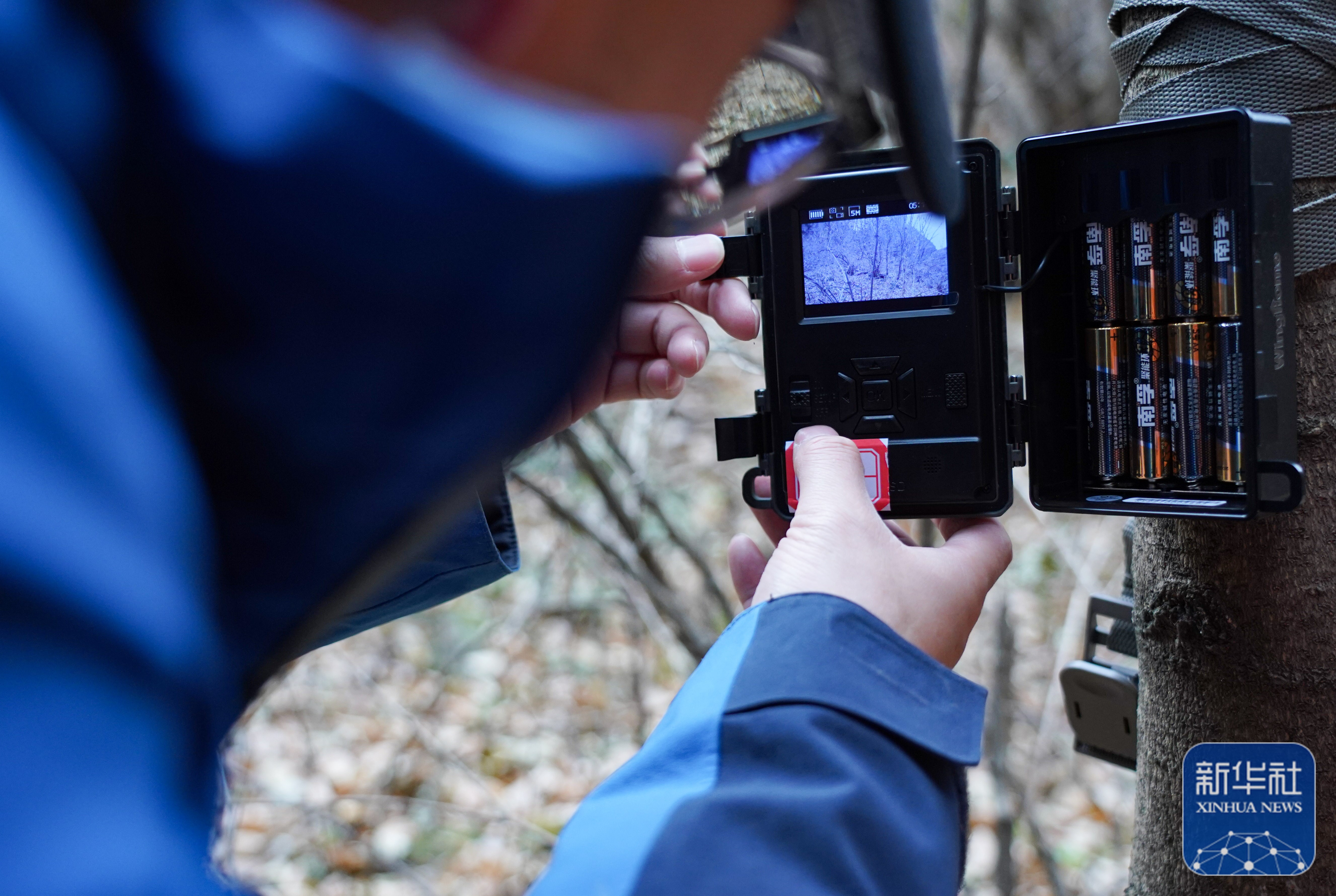 保护区工作人员检查红外相机的运行状况(11月9日摄)。