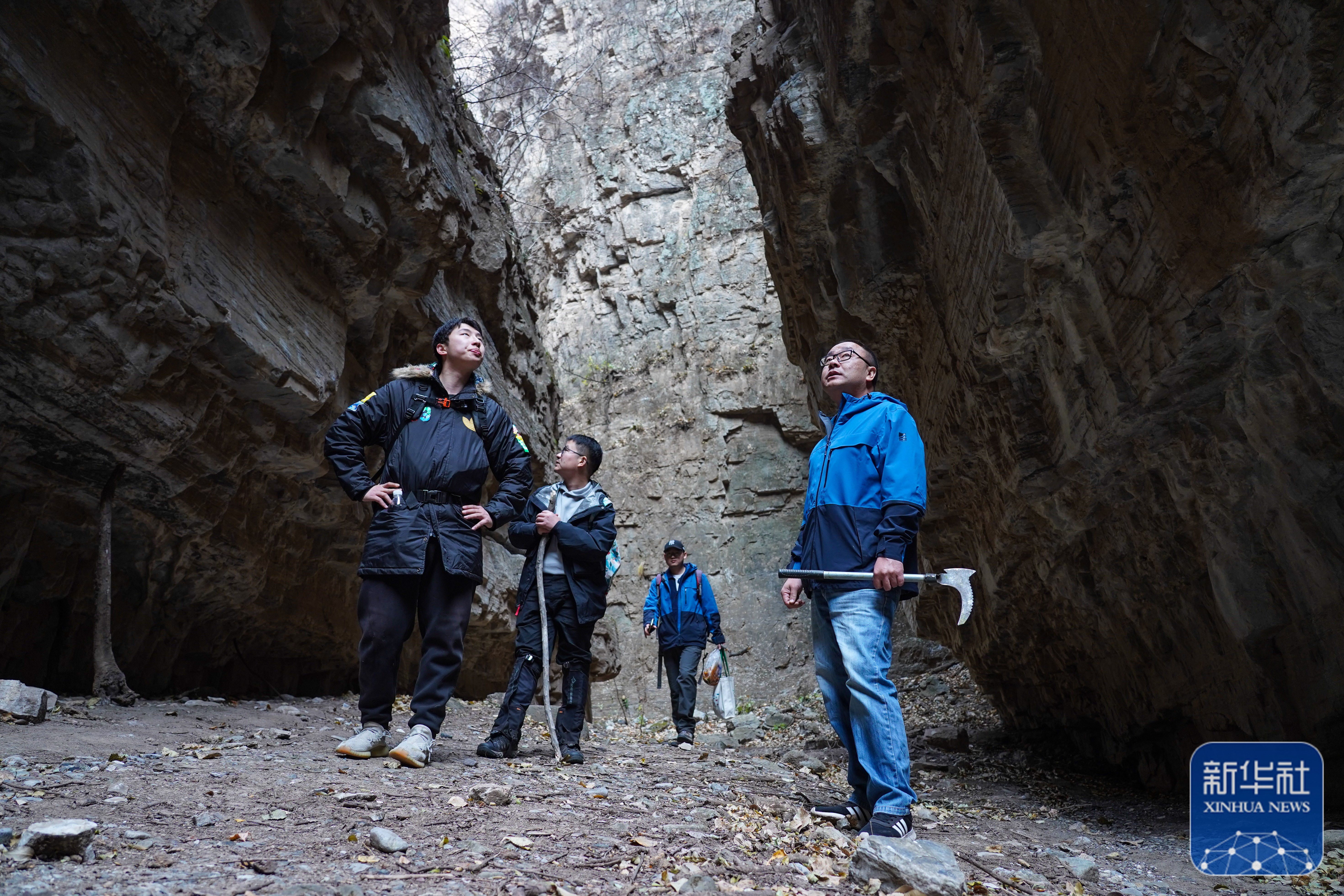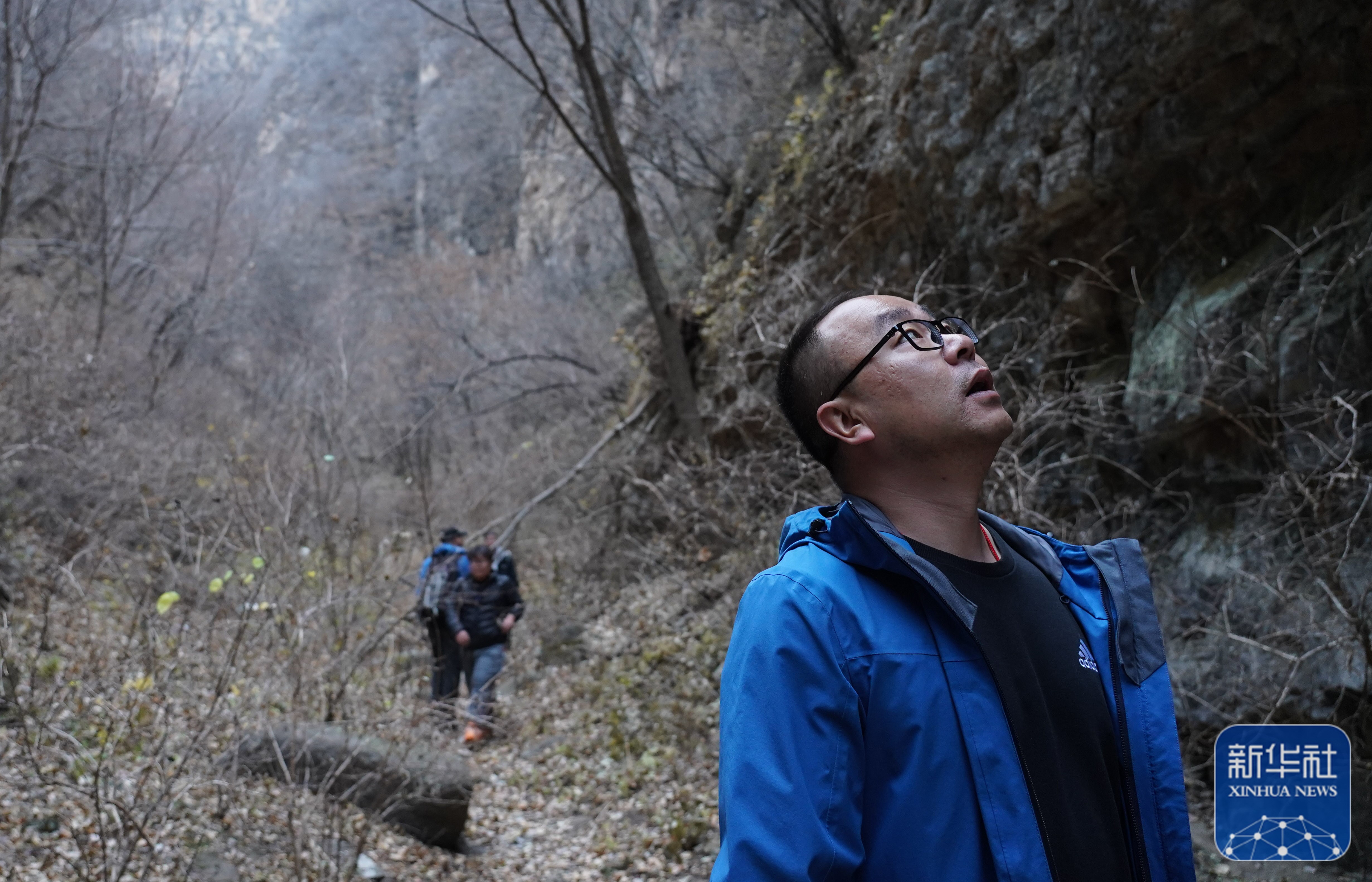 赵明腾(右一)和同事们在深山中(11月9日摄)。