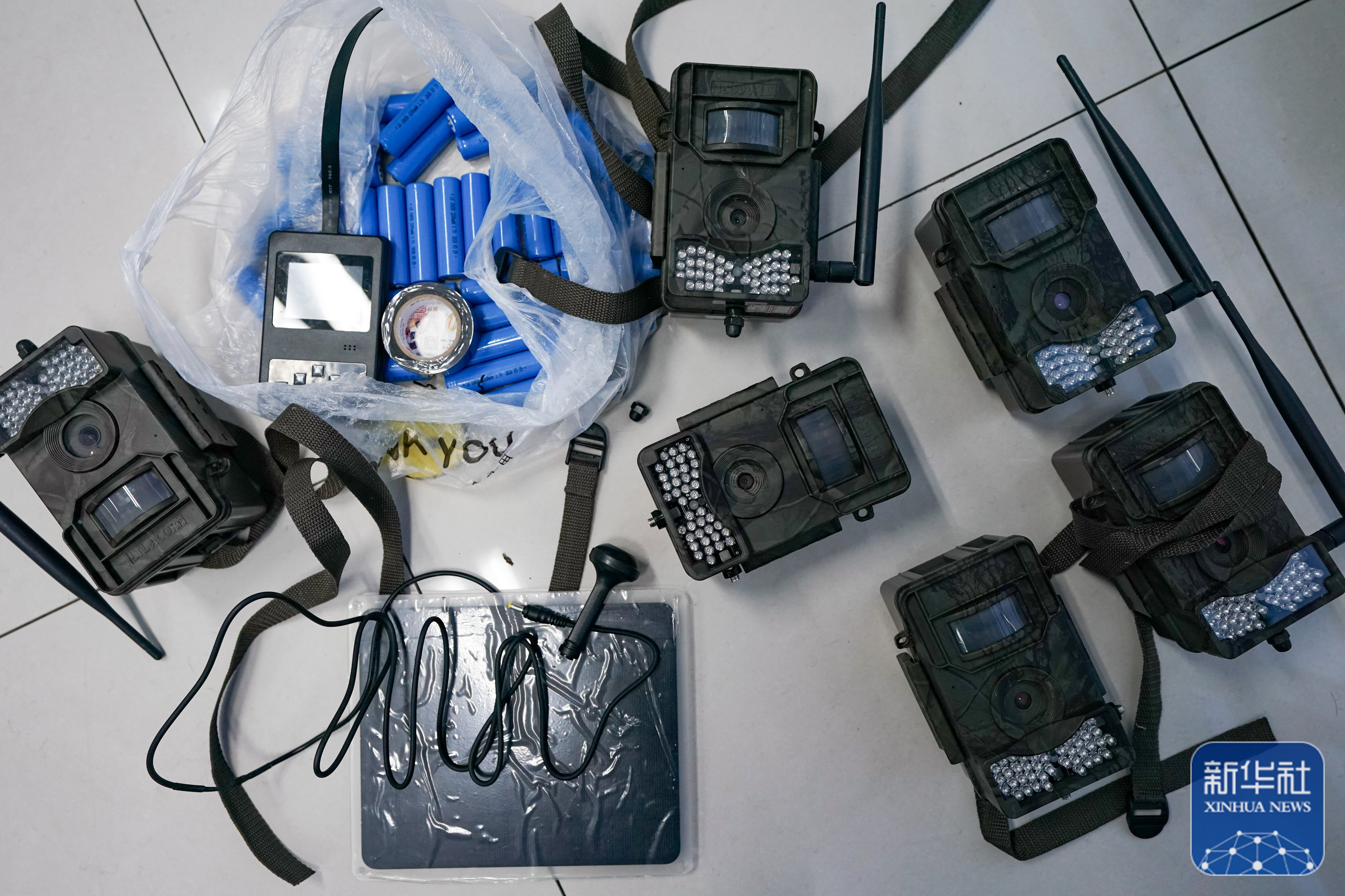 这是用于野生动物监测的红外相机、电池、太阳能板等设备(11月8日摄)。