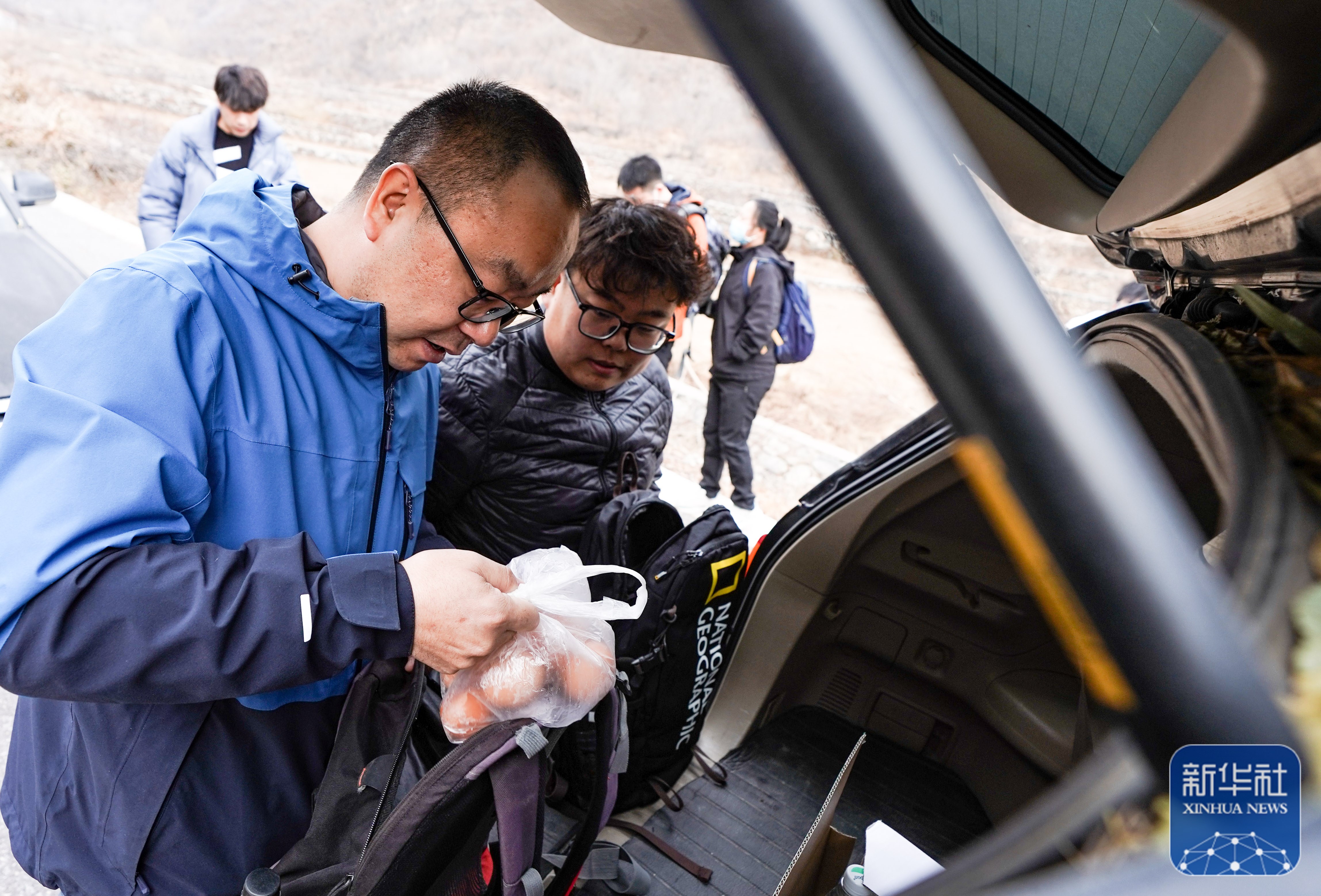 赵明腾(前)在进山前将一袋作为午餐的煮鸡蛋装入背包中(11月9日摄)。