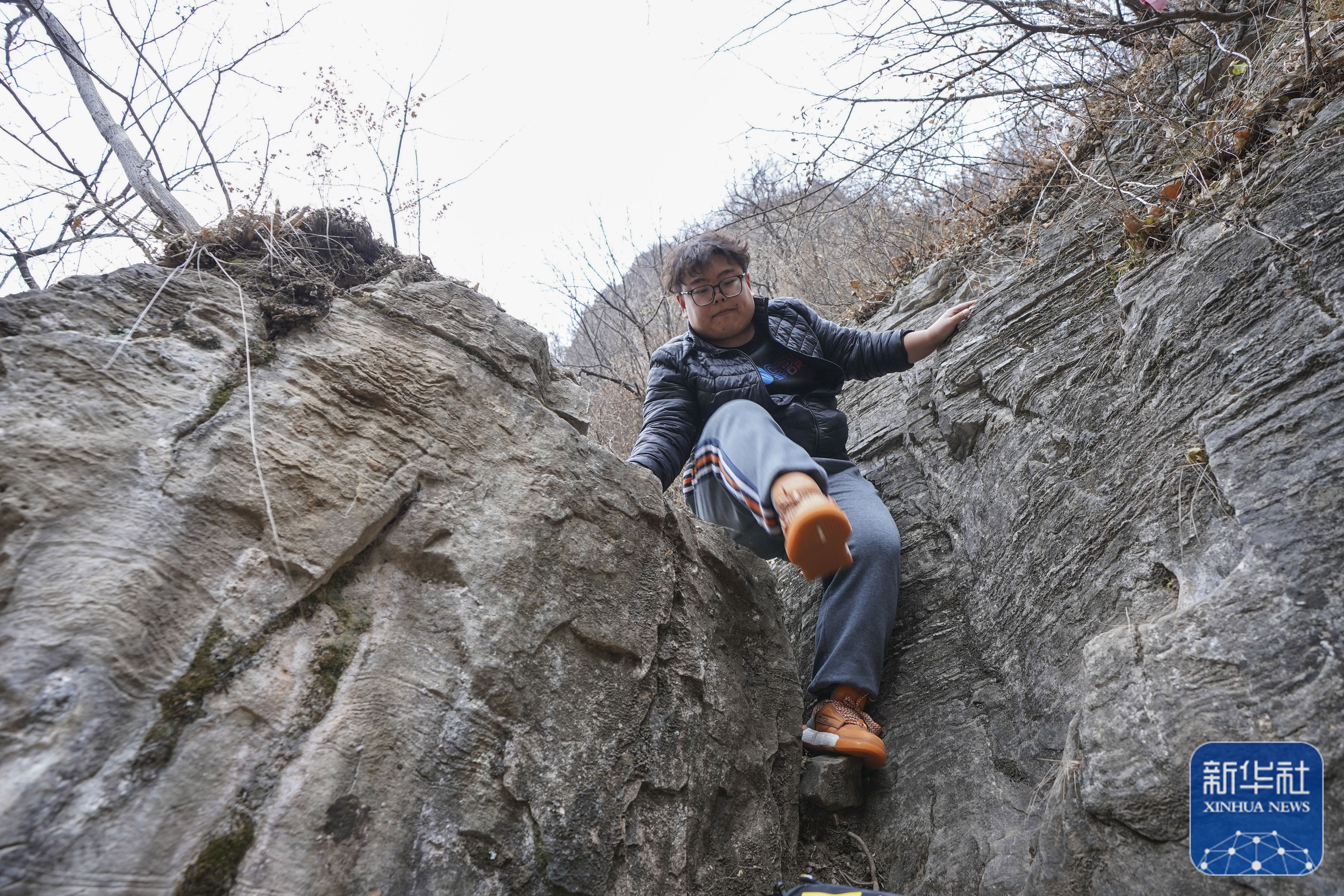 保护区工作人员张笑晨在途中攀爬山石(11月9日摄)。