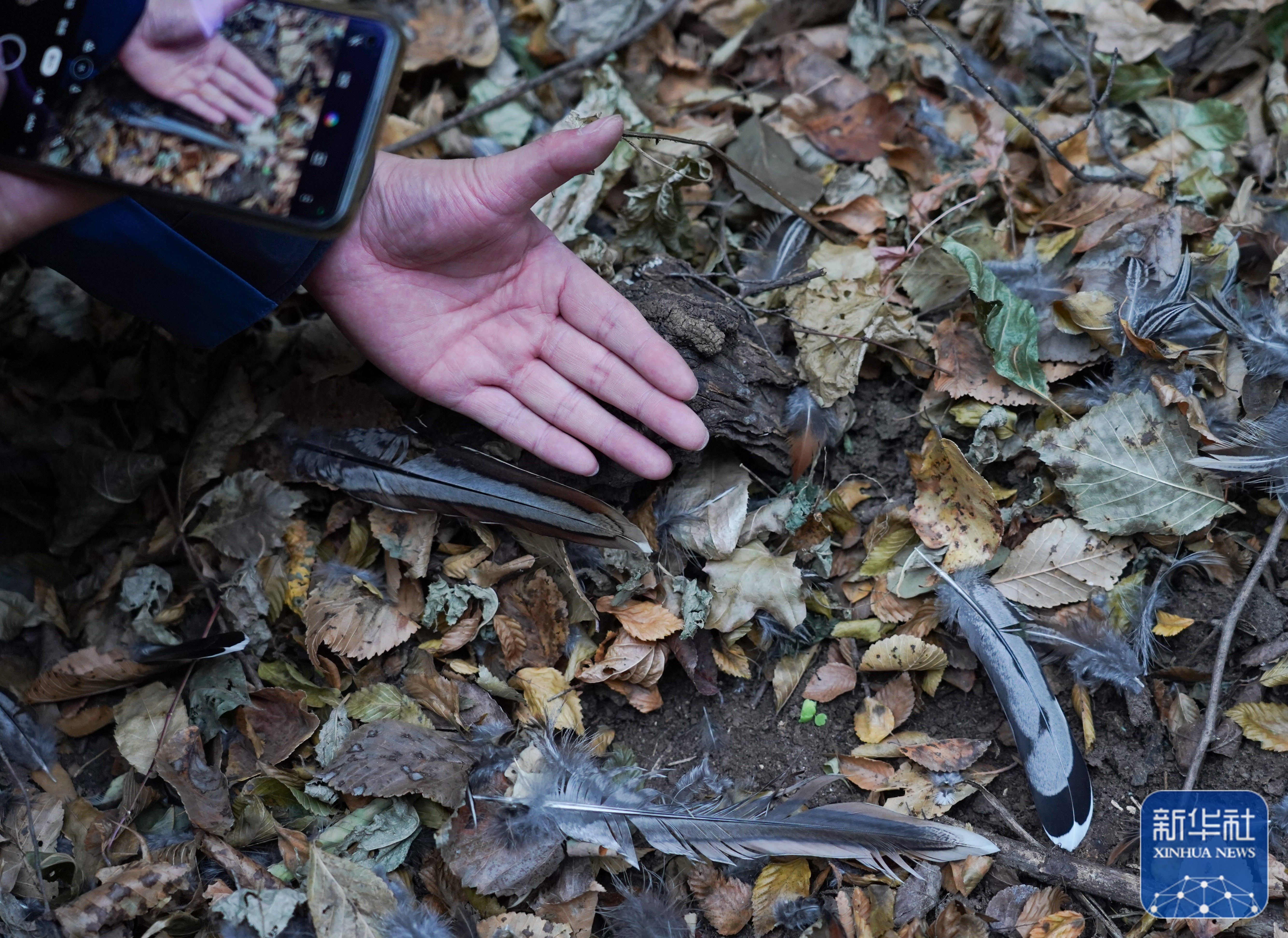 保护区工作人员给地上的羽毛拍照,用于辨别物种信息(11月9日摄)。