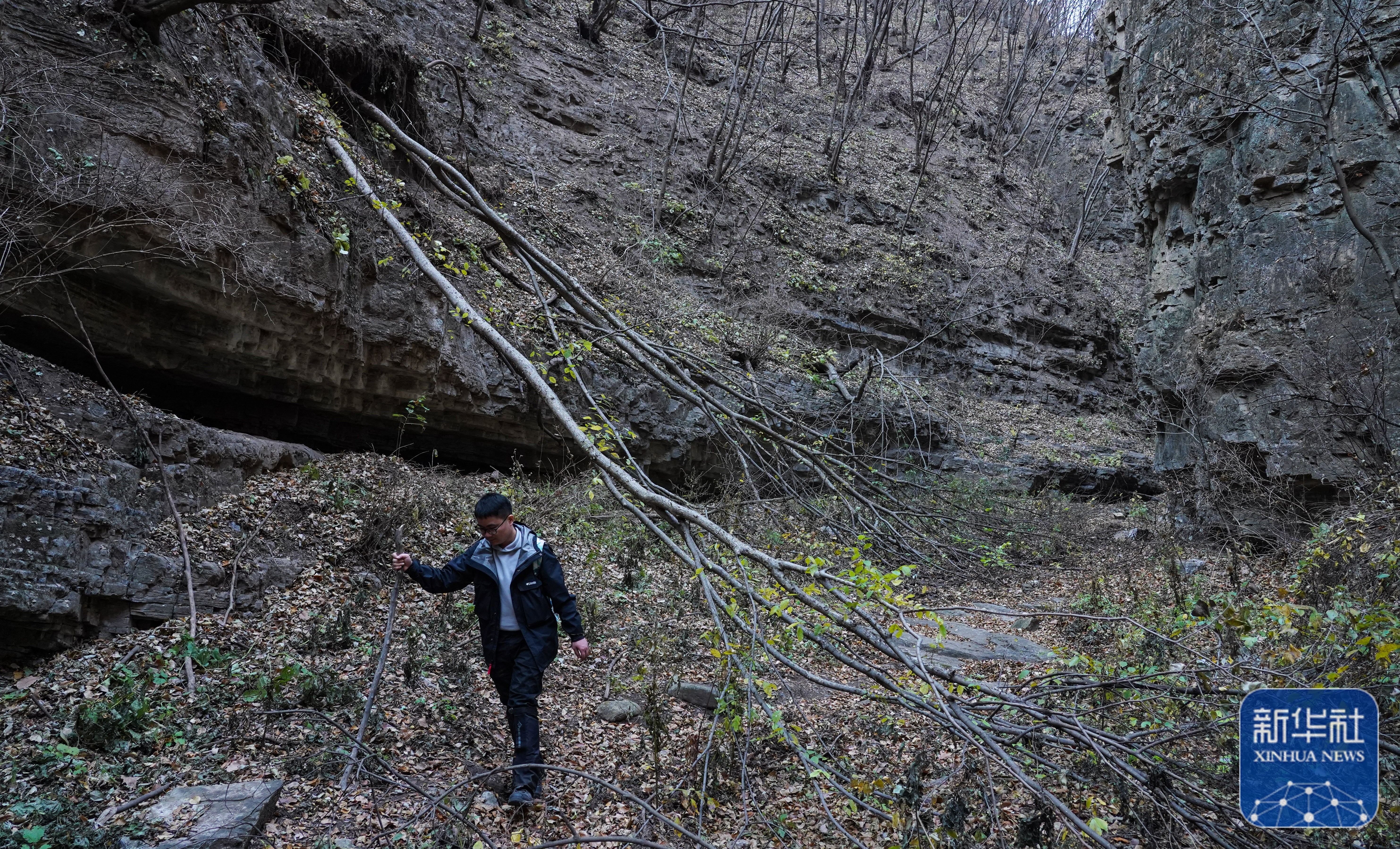 赵明腾停下脚步观察山中野生动物的栖息环境(11月9日摄)。