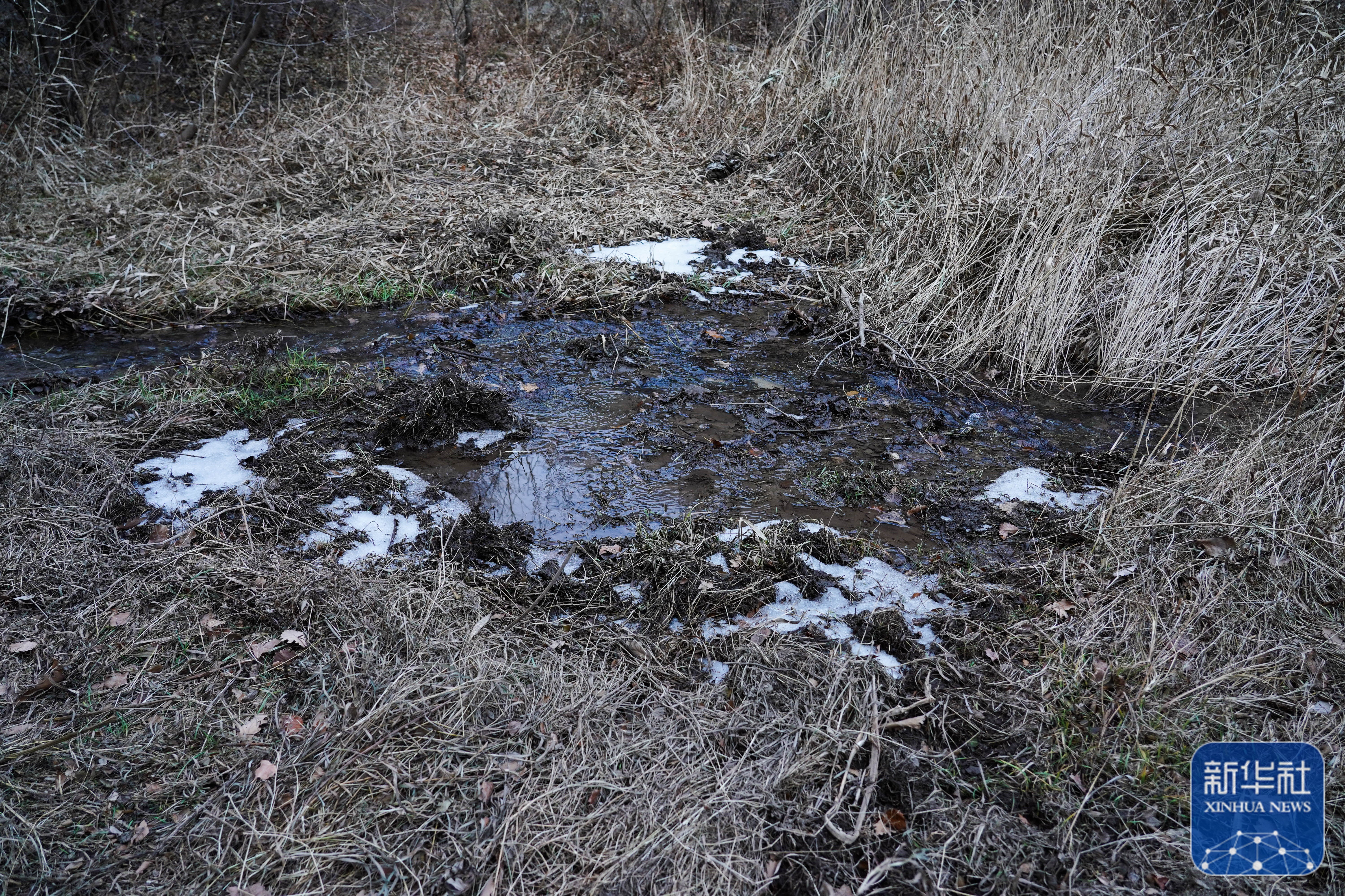深山里的一段小溪已经开始结冰,水边的土壤有疑似野生动物的活动痕迹(11月9日摄)。