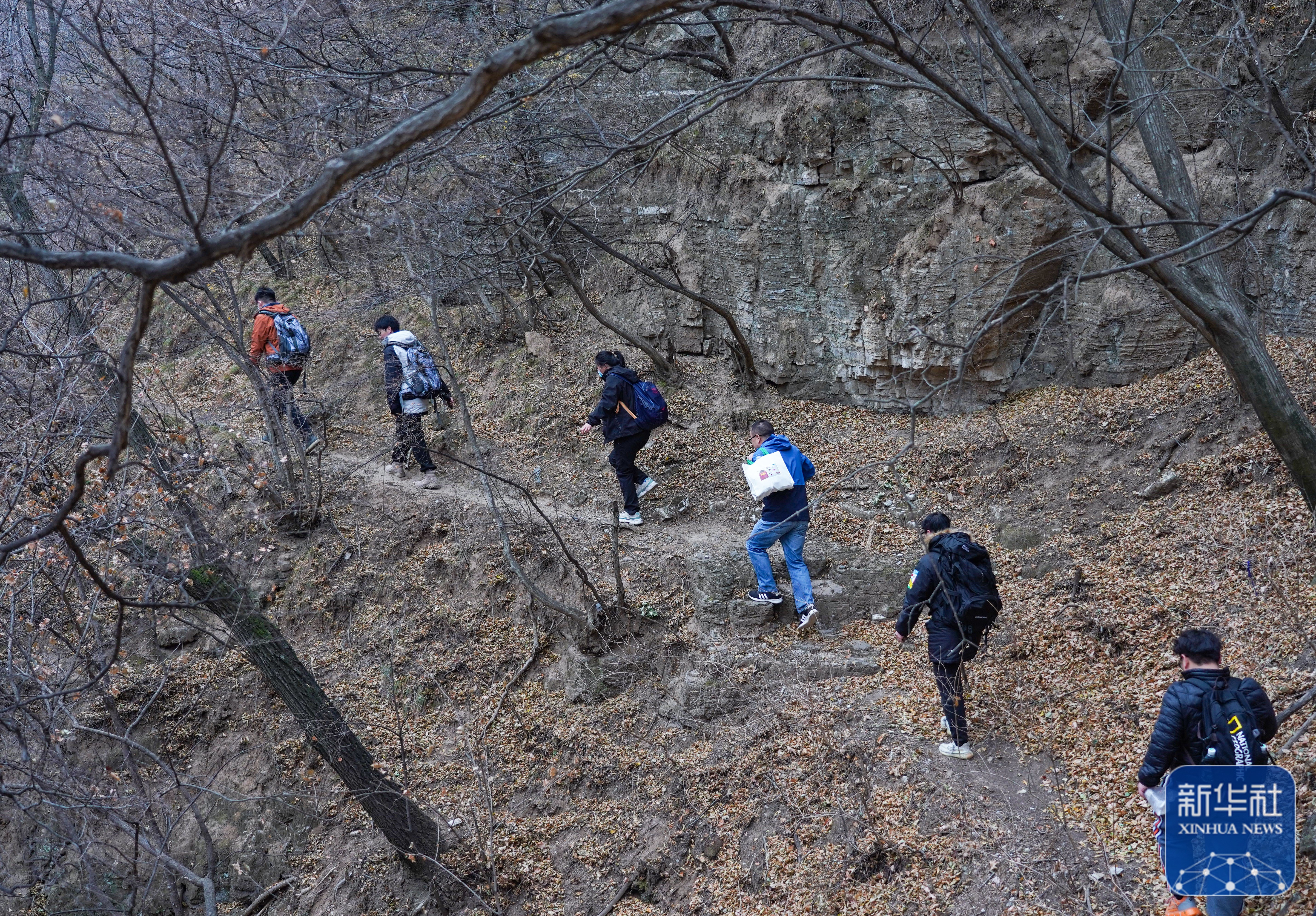 赵明腾(右三)和同事们走在深山中(11月9日摄)。