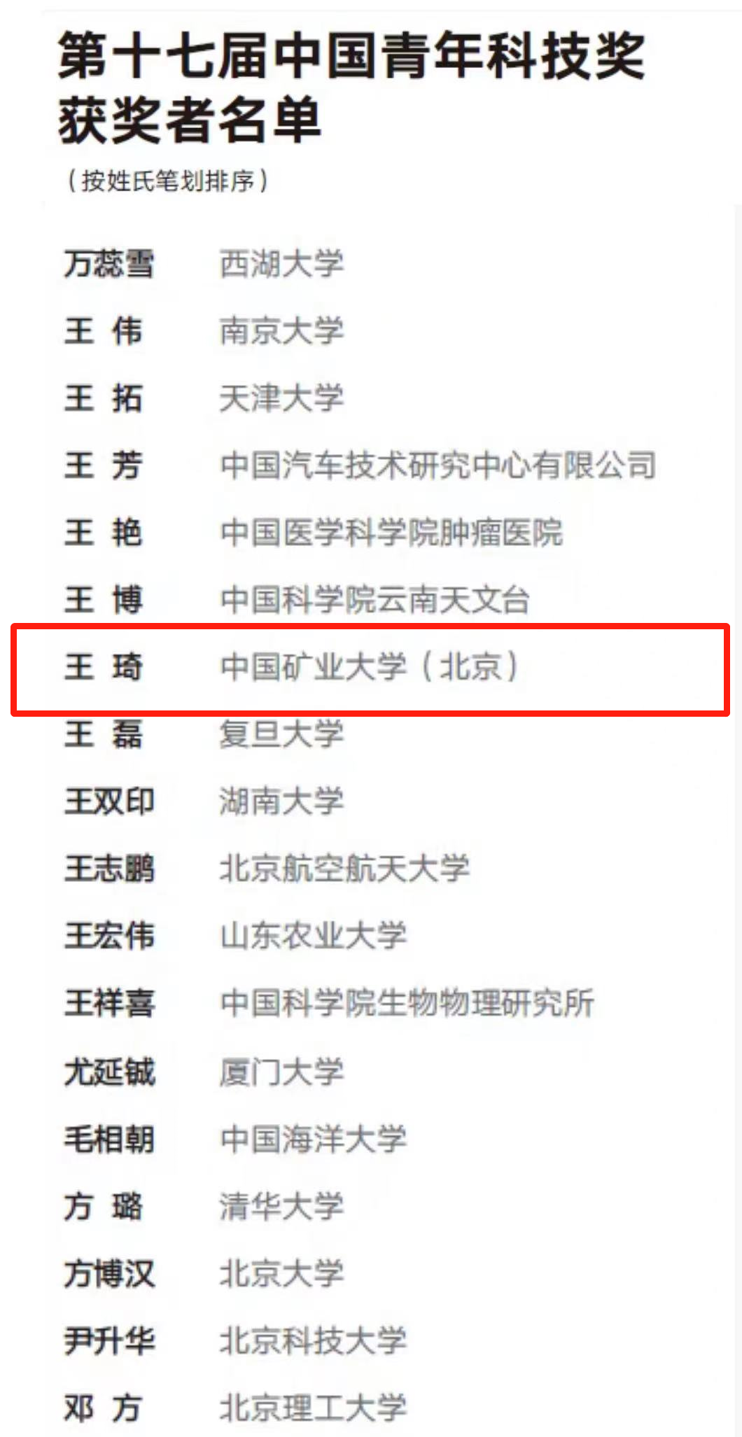 2022年11月12日,在温州举行的2022世界青年科学家峰会开幕式上,第十七届中国青年科技奖揭晓并举行颁奖仪式。中国矿业大学(北京)深部岩土力学与地下工程国家重点实验室王琦教授获得“第十七届中国青年科技奖”。