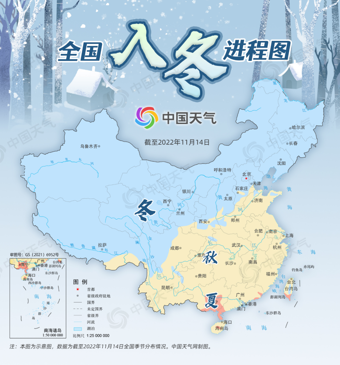 截至11月13日,上一股冷空气的影响已基本收尾。在它的影响下,中东部地区普遍降温6~10℃,东北中南部、内蒙古东南部、江南西部、西南地区东部等地降温14~18℃。在这股冷空气的推动下,新疆大部、华北平原大部已成功迈入气象学意义上的冬季,大城市中例如北京、天津也都已入冬。目前,冬季的脚步已经抵达河北南部、山西南部、陕西南部一带,全国约有一半国土面积被冬天覆盖。