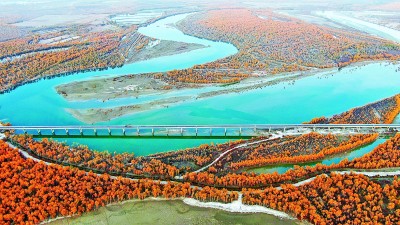 新疆沙雅县月亮湾景区的胡杨林披上“金装”,与碧水、大漠相互映衬,构成一幅秀美的生态画卷。新华社发