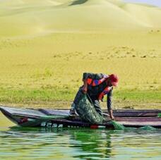新疆尉犁县罗布湖淡水养殖场工人在捕捞螃蟹。王雪摄/光明图片