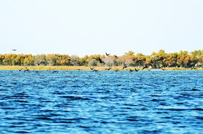 在新疆尉犁县罗湖罗克管护站,鸟儿在一处海子上空飞翔。新华社发