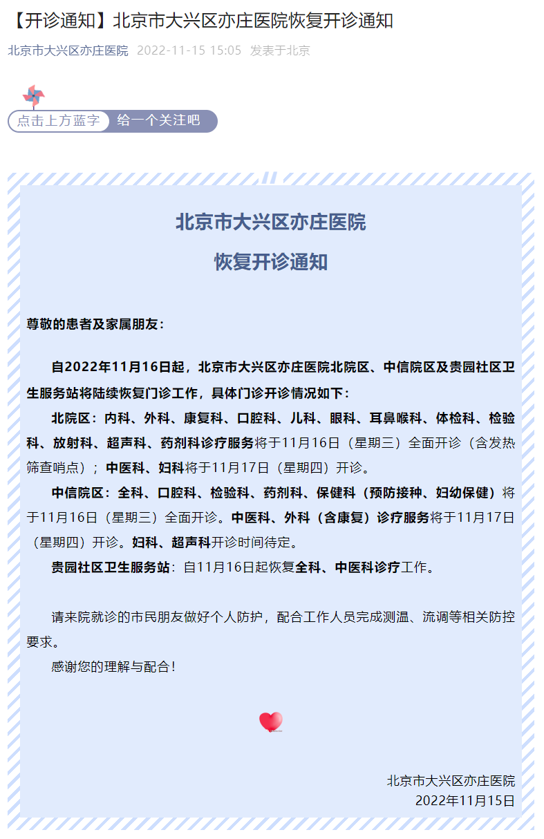 北京市大兴区亦庄医院微信公众号消息,自2022年11月16日起,北京市大兴区亦庄医院北院区、中信院区及贵园社区卫生服务站将陆续恢复门诊工作,具体门诊开诊情况如下: