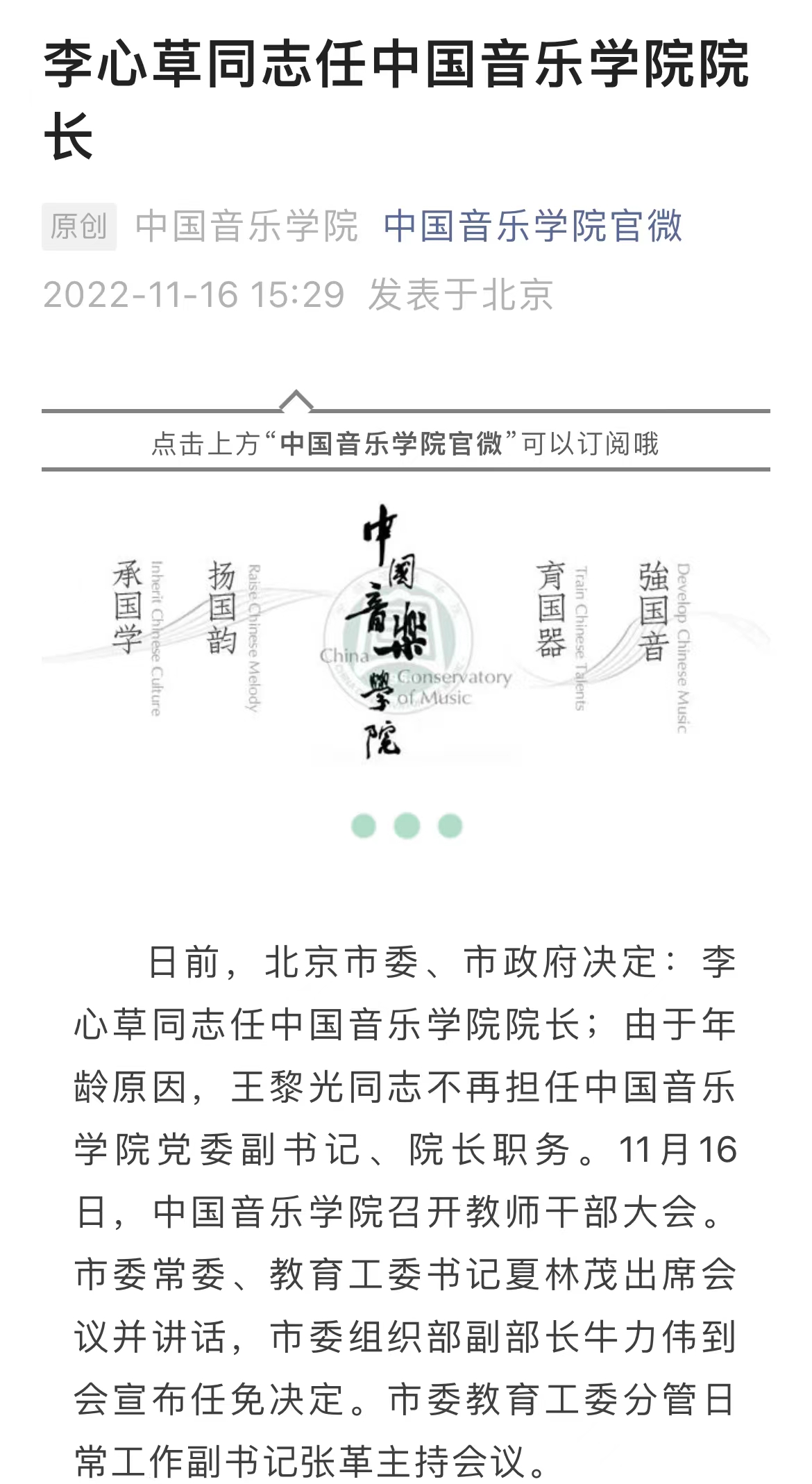 11月16日,中国音乐学院正式发布公告,指挥家李心草任中国音乐学院院长。