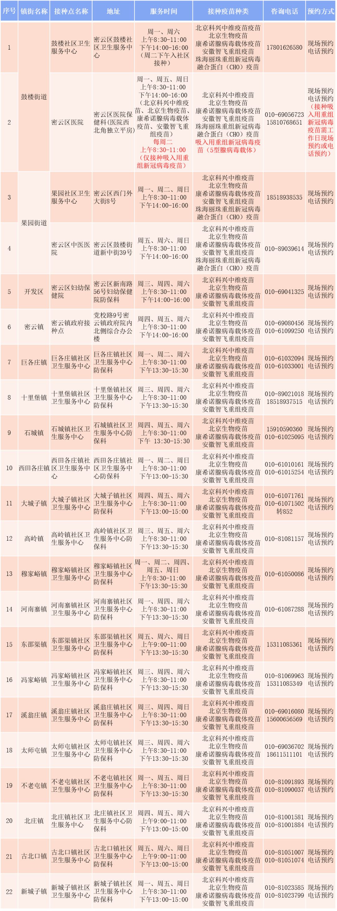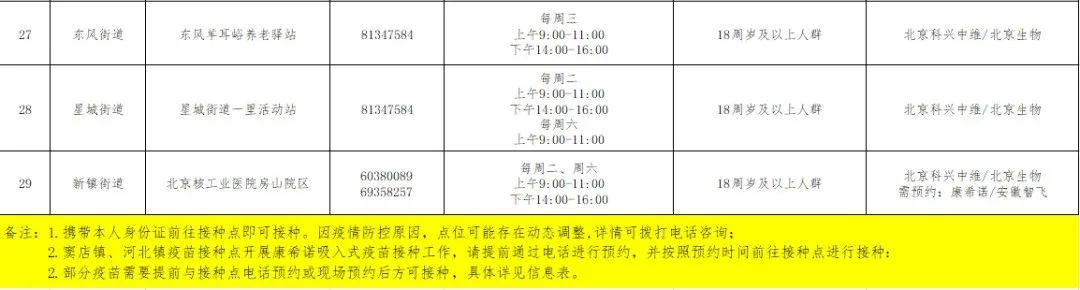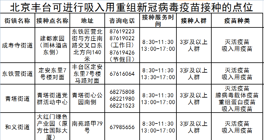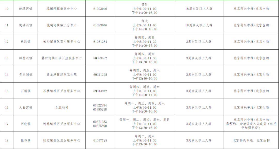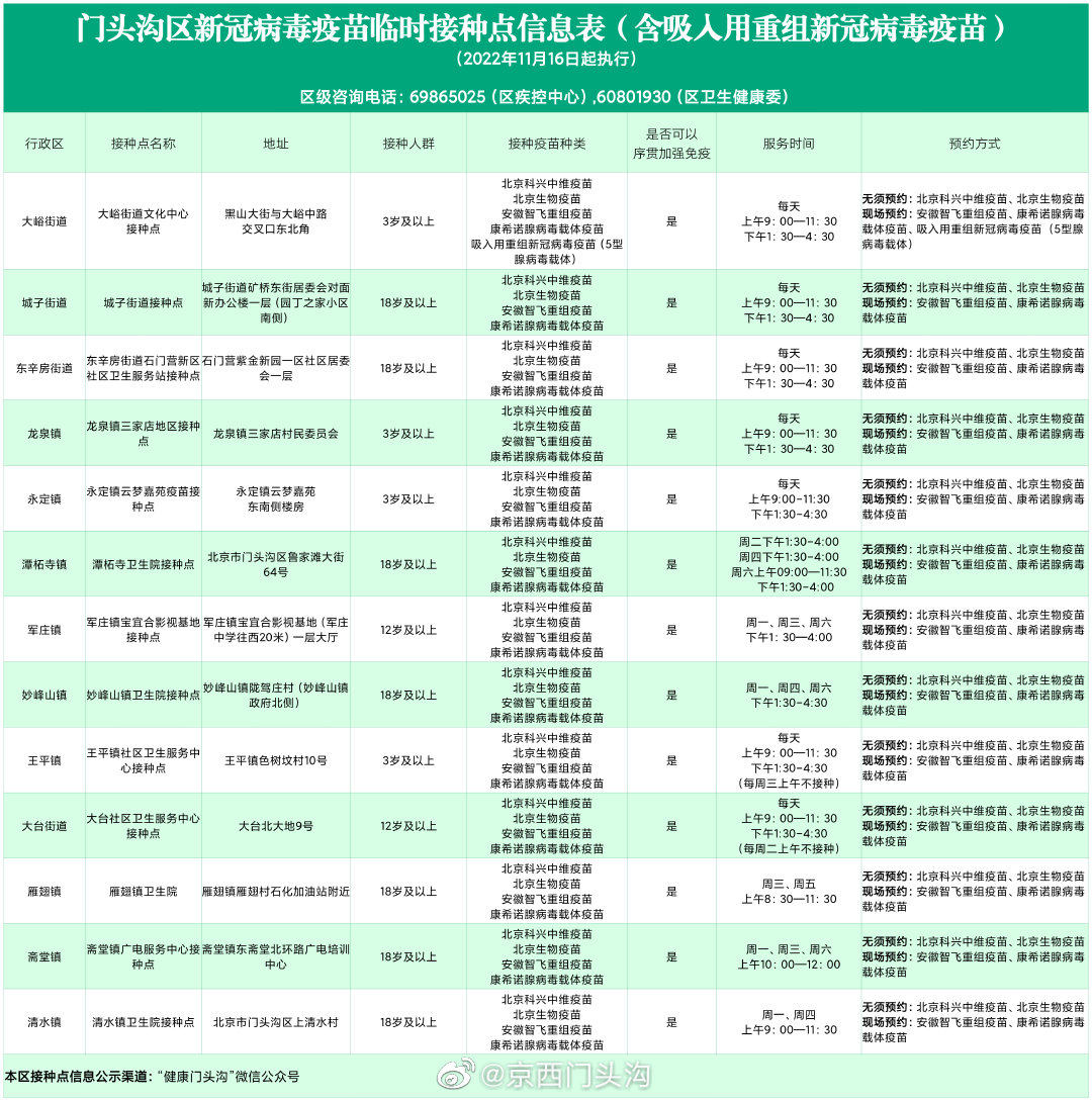 11月16日起,房山区可以预约接种吸入用重组新冠病毒疫苗(5型腺病毒载体),目前仅用于加强免疫接种。接种地点为窦店镇交道社区卫生服务中心、河北镇社区卫生服务中心,具体预约方式详见下表。