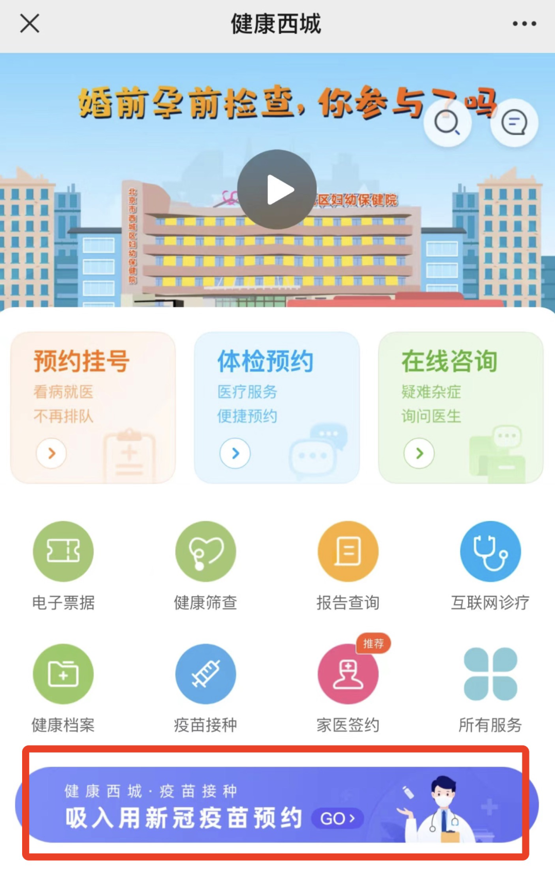 在“健康西城”小程序主页,点击“吸入用新冠疫苗预约”栏目后可进行线上预约。