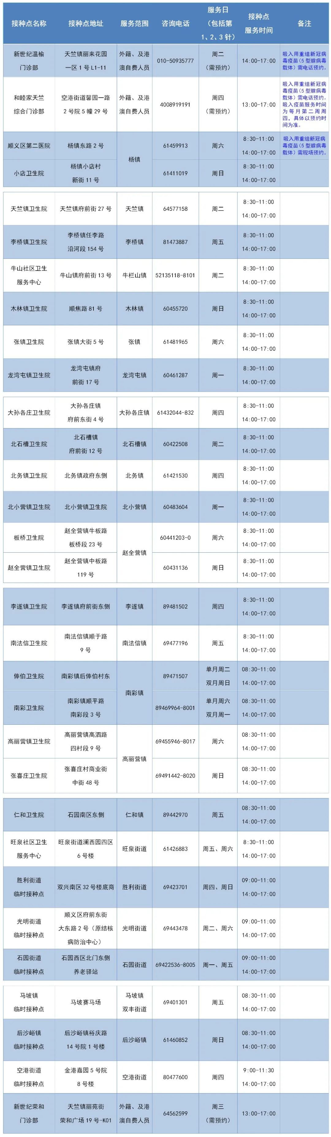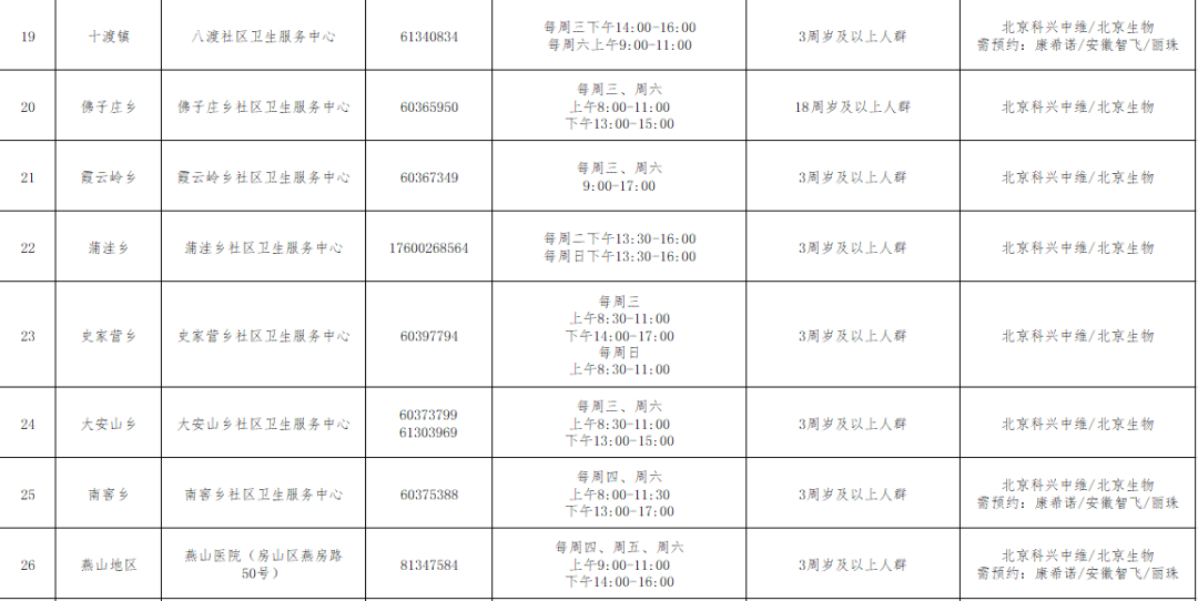 房山区新冠疫苗接种点信息表