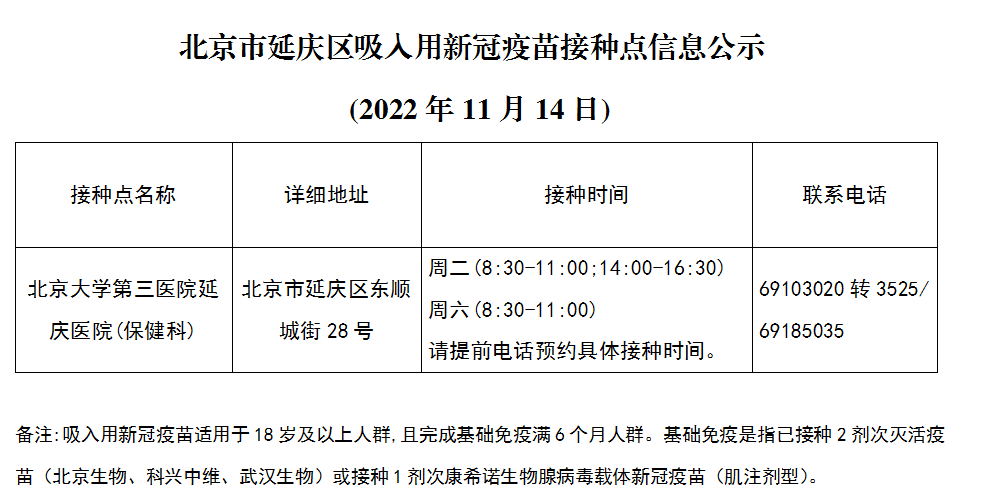 近日,延庆政府网公示了延庆区吸入用新冠疫苗接种点信息: