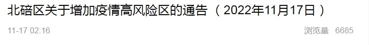 重庆市北碚区新型冠状病毒肺炎疫情防控指挥部关于增加疫情高风险区的通告(2022年11月17日)。
