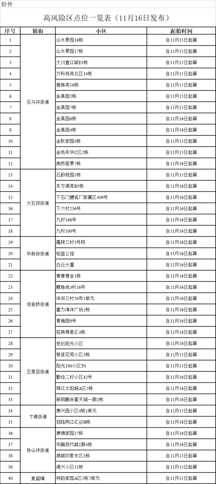 大石坝街道:石韵桂园1栋、东方港湾B5栋、下石门搪瓷厂家属区409号、下六村236号、九村(100号、166号);