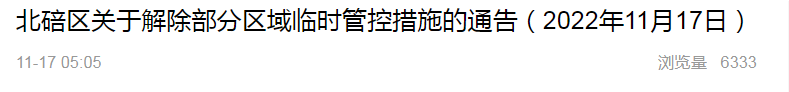 重庆市北碚区新型冠状病毒肺炎疫情防控指挥部关于解除部分区域临时管控措施的通告(2022年11月17日)。