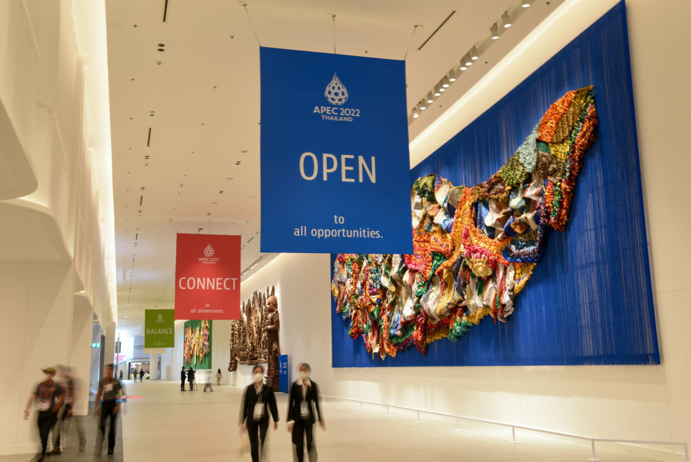曼谷商业区的诗丽吉王后国家会议中心是亚太经合组织第二十九次领导人非正式会议主会场,蓝、红、绿三色标语格外醒目,组成这次会议的主题“开放、联通、平衡”。