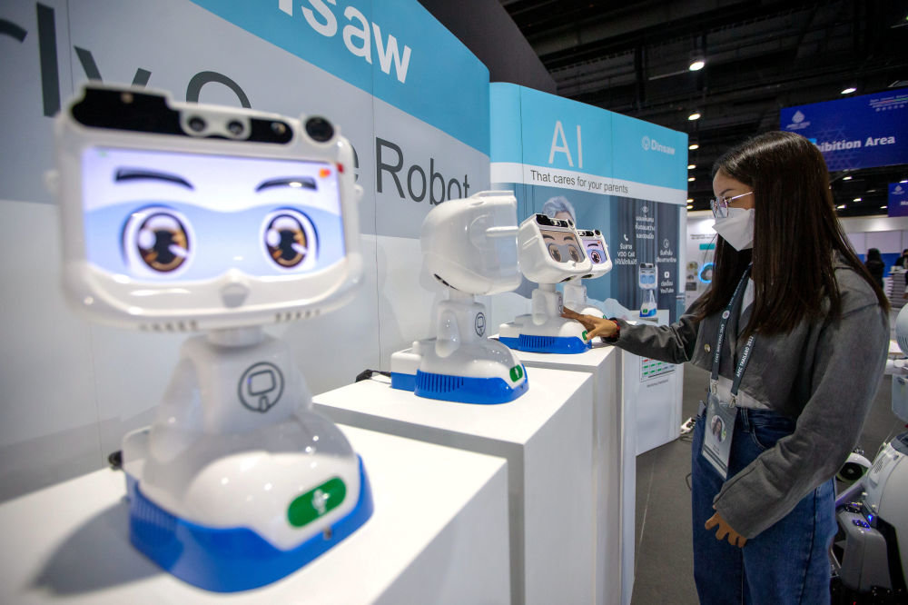 11月14日,在泰国首都曼谷,工作人员在APEC会议媒体中心与机器人互动。新华社记者 王腾 摄