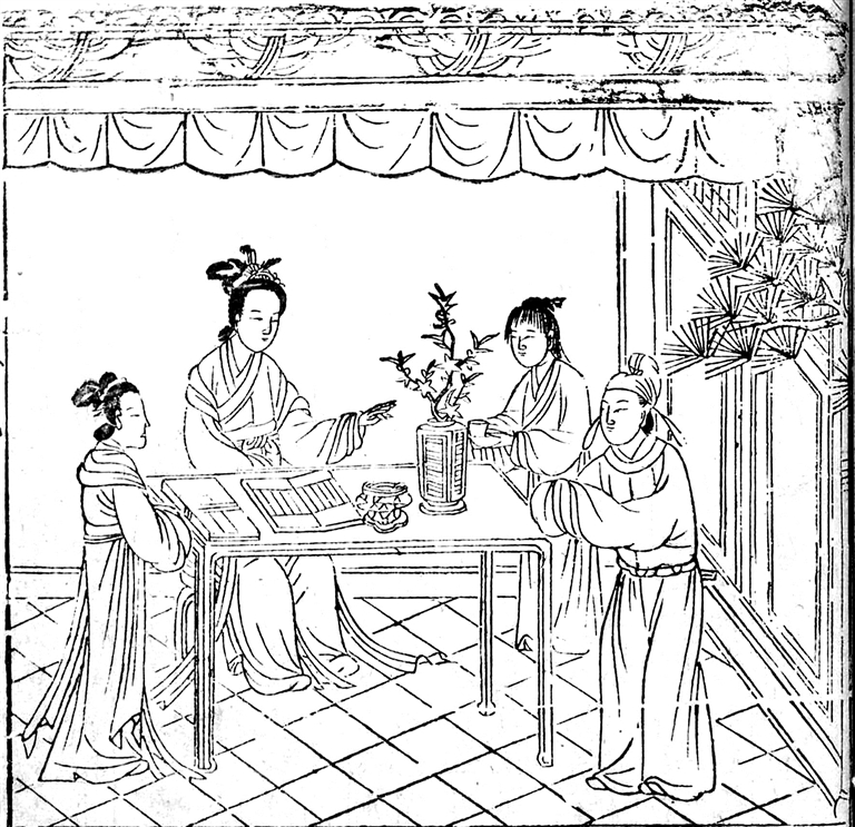 下图:明代一部著作中的班昭著述图,明清书籍盛行插图,但有时存在明显的时代错置,如这幅图中显示的纸质书籍、高足家具在班昭的时代都是不常见或不存在的。(资料图片)