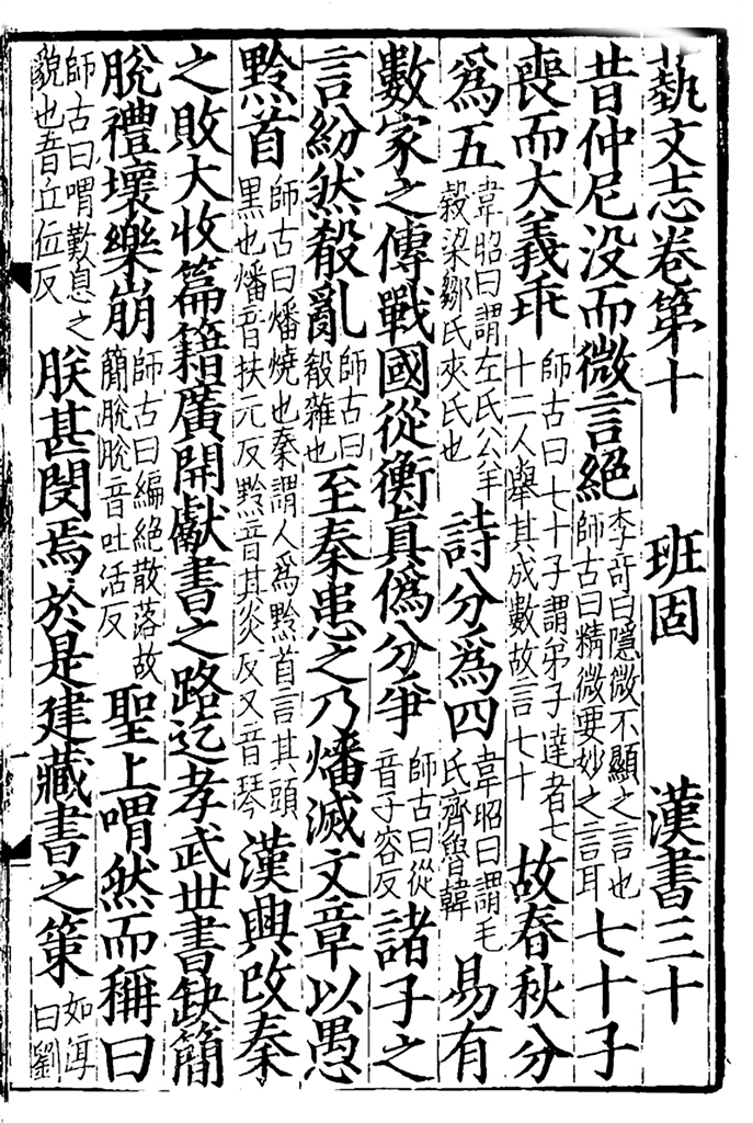中图:《汉书》书影,这一页展示的是《艺文志》,《汉书·艺文志》是我国现存最早的目录学文献,对于研究当时的思想世界极有价值,《艺文志》是班固在西汉学者刘向父子的著作基础上撰成的。
