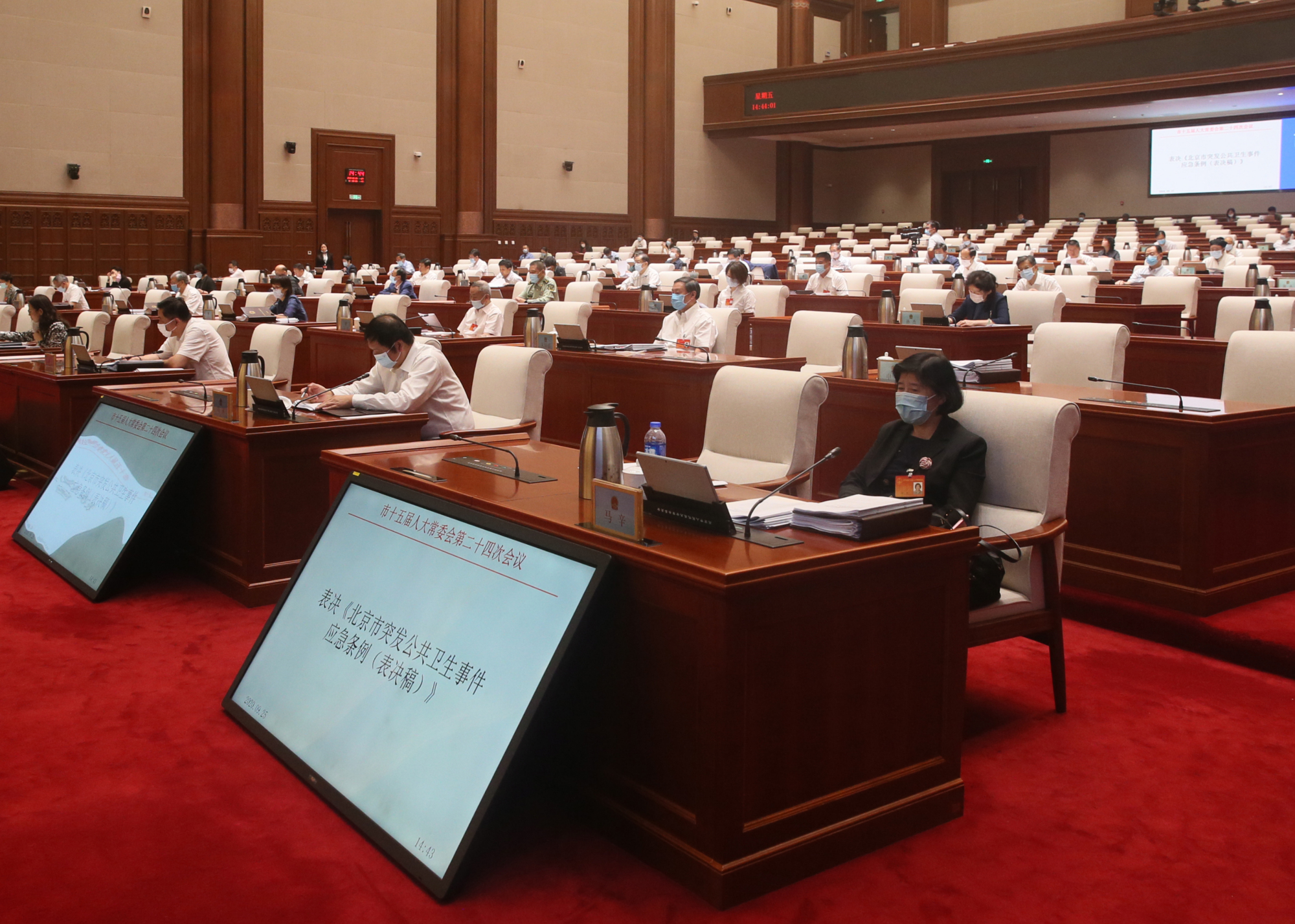 为加强依法战“疫”力度,市人大常委会按照“衔接配套、健全体系、急用优先”工作原则,及时启动20部公共卫生领域地方性法规制定修订工作。图为2020年9月25日市十五届人大常委会第二十四次会议审议通过《北京市突发公共卫生事件应急条例》。