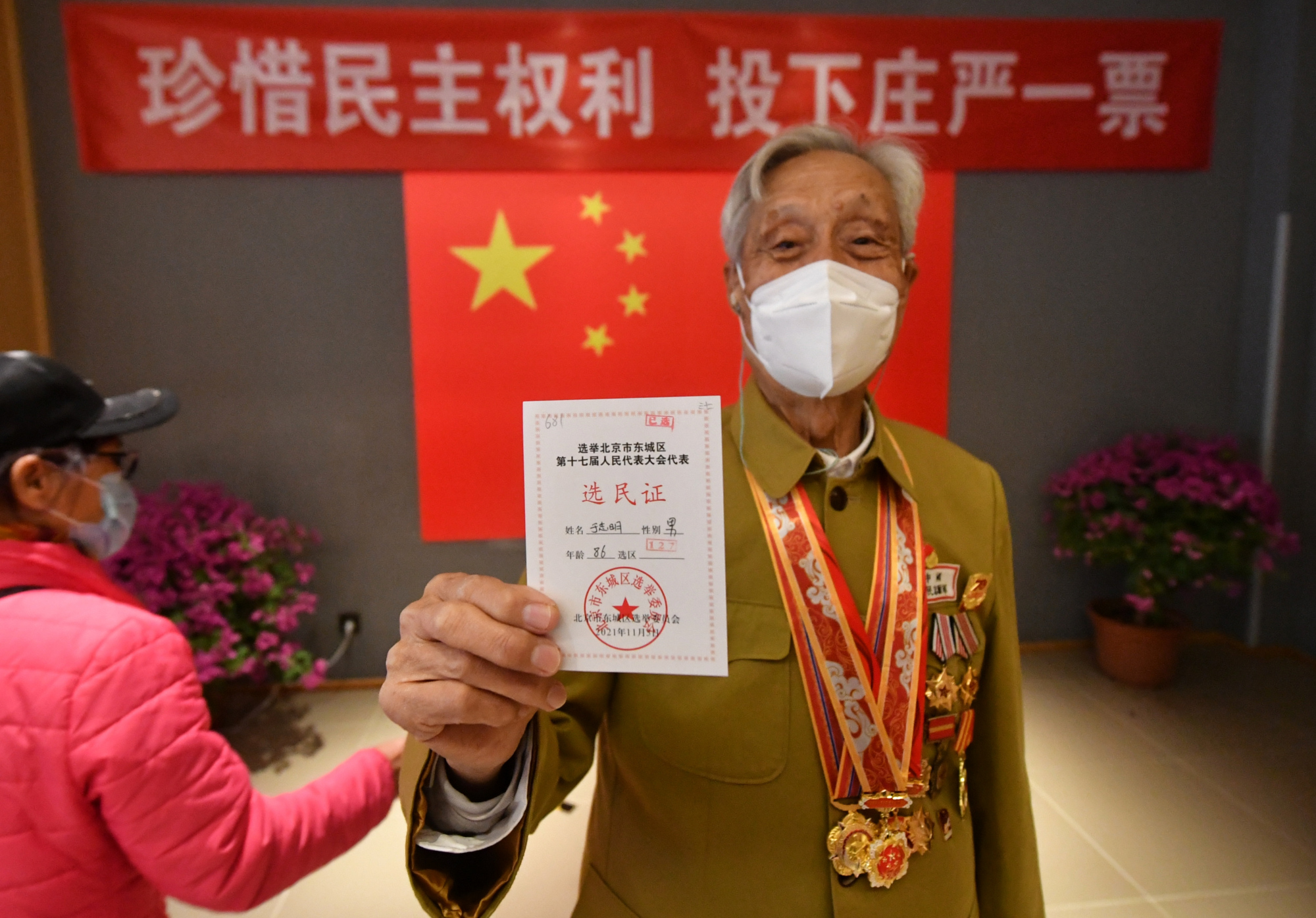 图为2021年11月5日,86岁的老兵于志明在东城区体育馆路地区投票站投下神圣一票。