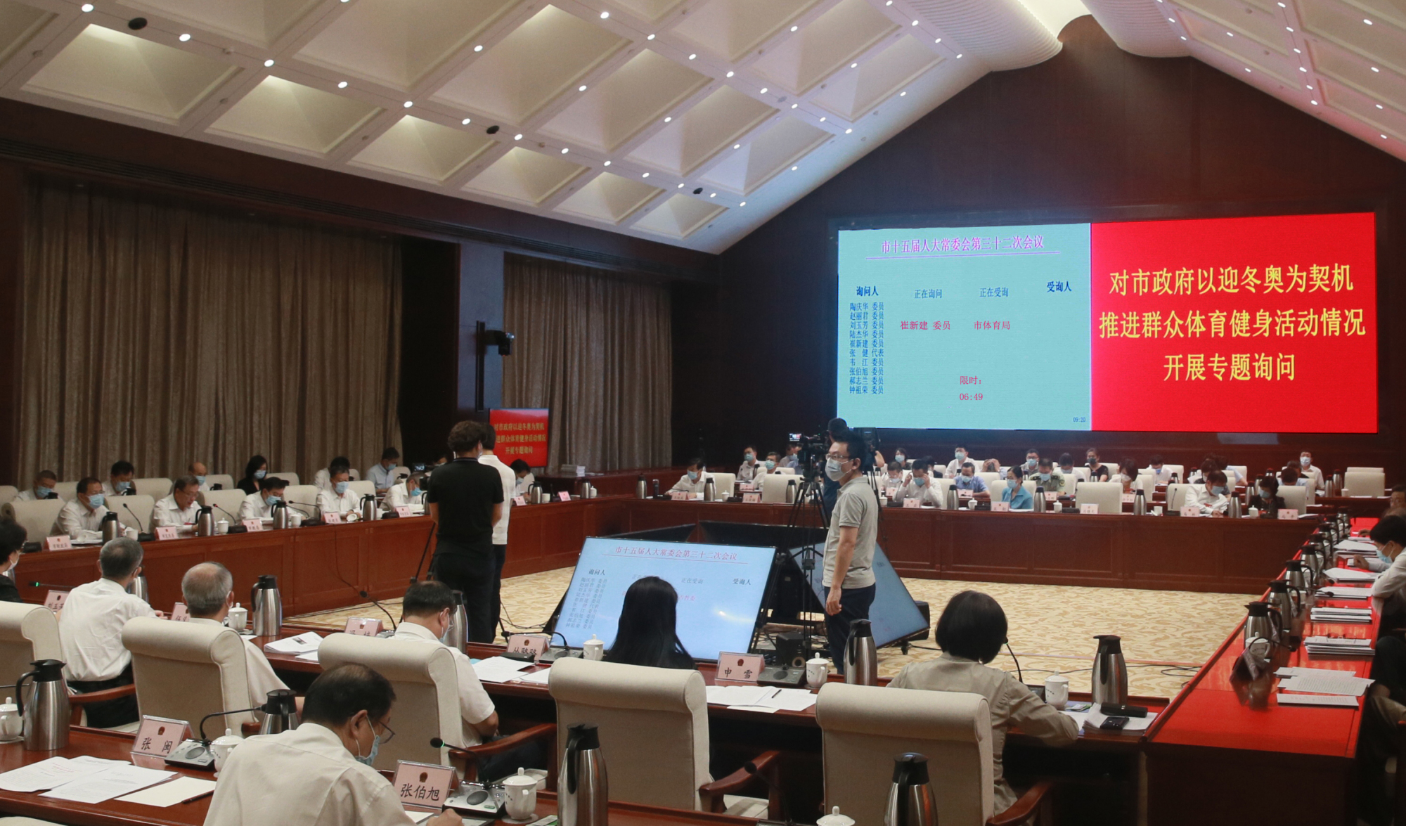 就服务业扩大开放试点、审计发现问题整改以及审判机关知识产权司法保护、检察机关公益诉讼等开展专题询问。图为2021年7月,市十五届人大常委会第三十二次会议结合《北京市全民健身条例》实施情况,专题询问政府关于以迎冬奥为契机,推进群众健身情况。
