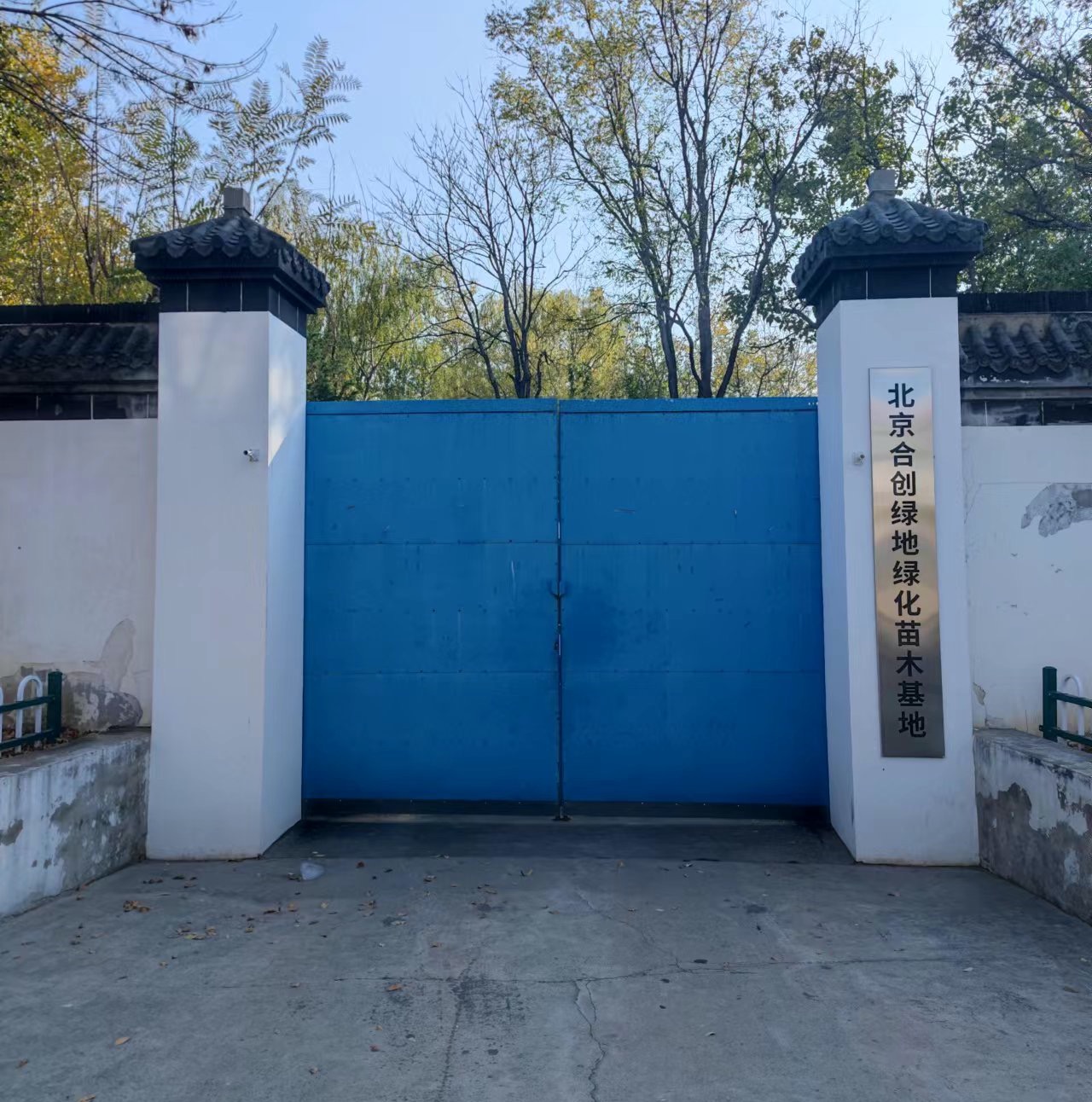 记者又绕行到园区的北侧,视线被围墙阻挡,无法再看到里面。北侧有一扇小门,不过蓝色铁门紧闭,旁边悬挂着“北京合创绿地绿化苗木基地”的牌子。