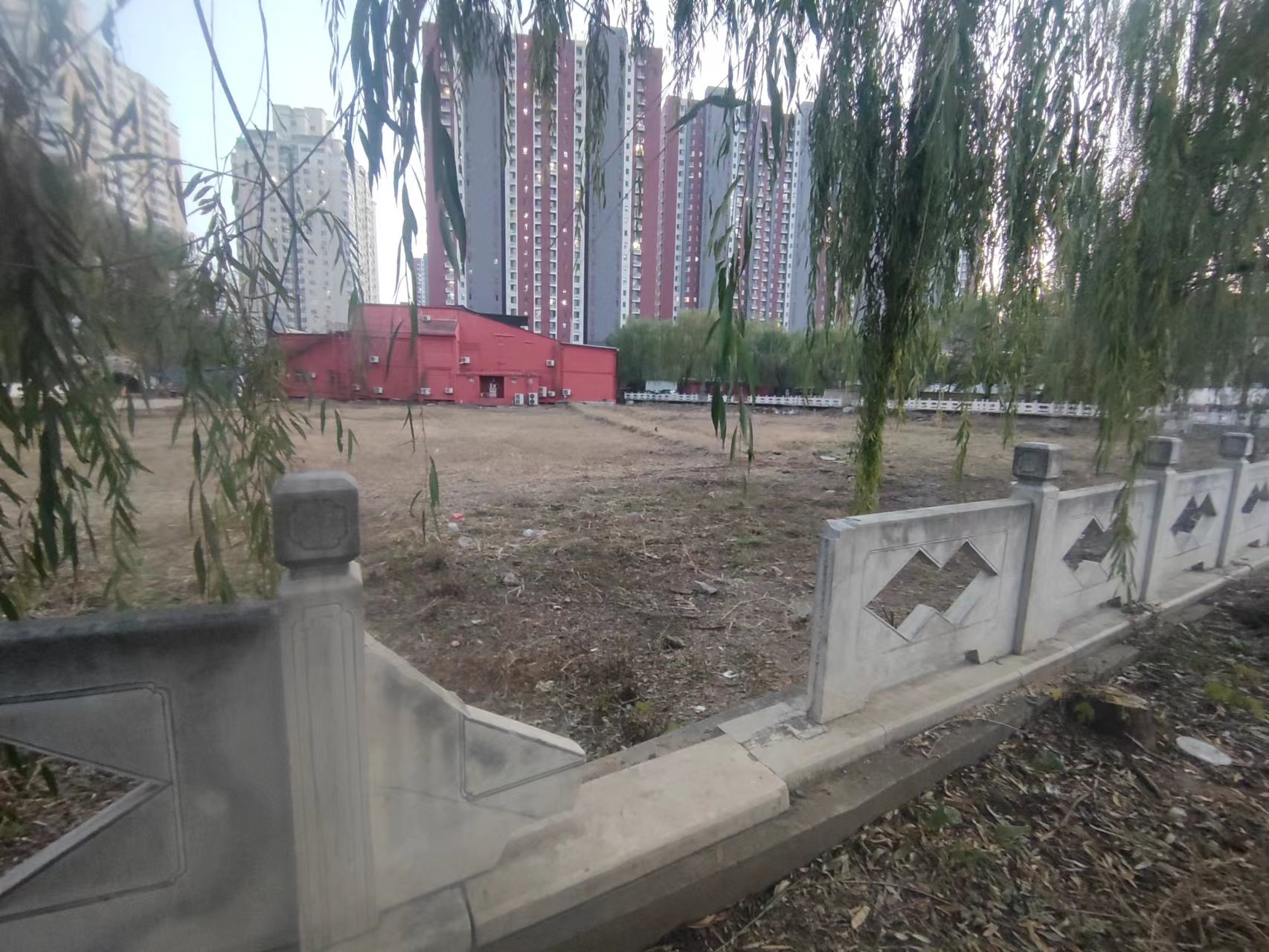 不过,从大门向里望去,有宠物狗、马匹等动物,还有晾衣架挂在栏杆上,明显有人居住。正门附近的植被错落有致,不像无人打理、完全荒废的样子。记者由正门外向东走去,外围都是一排挡板,完全看不到里面的情况。一直走到了东侧挡板的尽头,记者再向北走没多远,发现铁丝网代替了挡板,才得以一窥园区的部分面貌。只见一条小路两侧种满了行道树,满地的黄叶给人一种曲径通幽的感觉。沿着铁丝网继续向东北走,这部分园区种植了一些树木,裸露的荒地苫盖过,不过绝大部分绿网都已经残破不全。