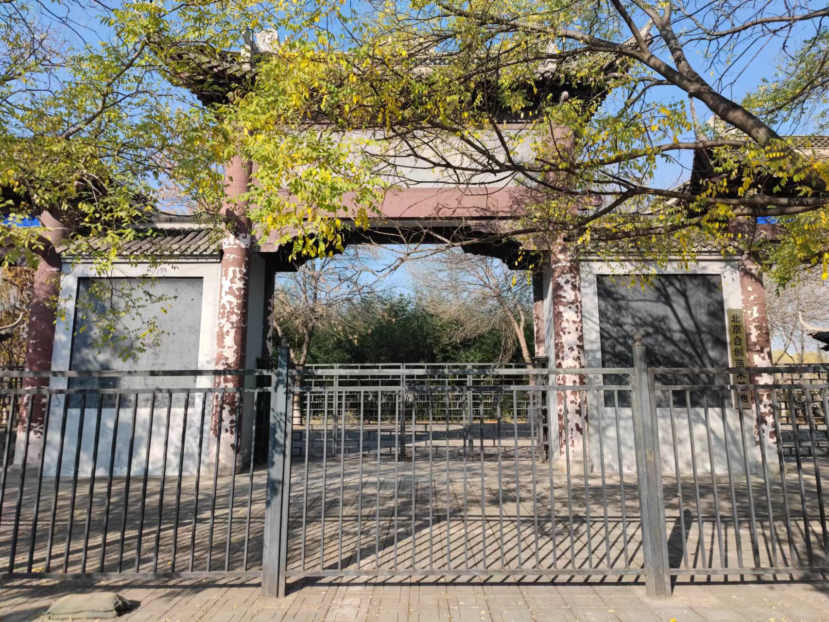 记者注意到,经年累月风吹日晒,牌楼柱子上的漆出现了不同程度的脱落,其中一根柱子旁悬挂着“北京合创苗木基地”的牌子。但从居民提供的老照片可以看到,正门上原来还有“宣颐公园”的字样,但是现在已经被清除掉了。
