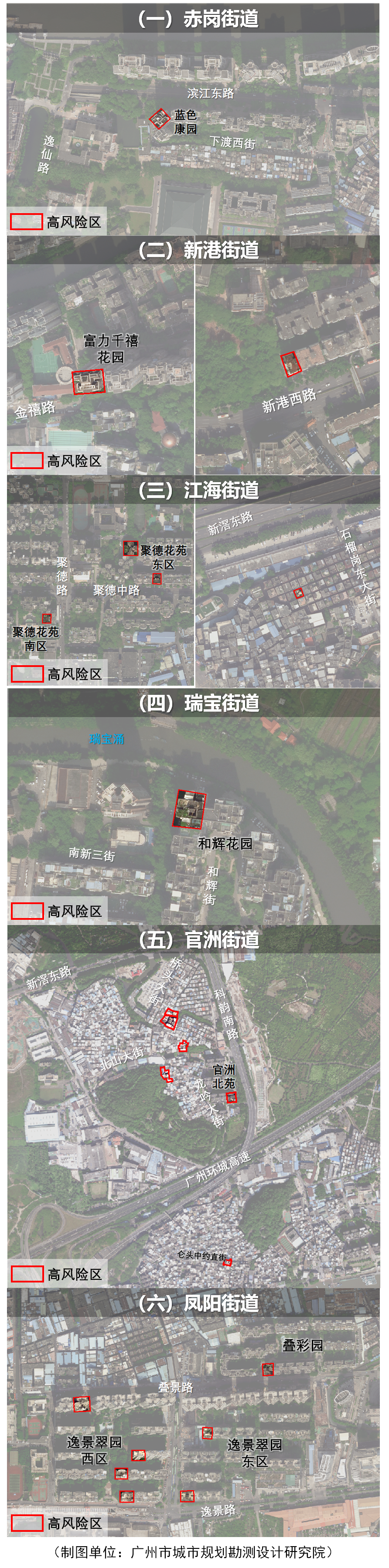 •海珠区:赤岗街道、新港街道、江海街道、瑞宝街道、官洲街道、凤阳街道、南石头街道、南洲街道、琶洲街道、昌岗街道、沙园街道、龙凤街道部分区域划为高风险区。