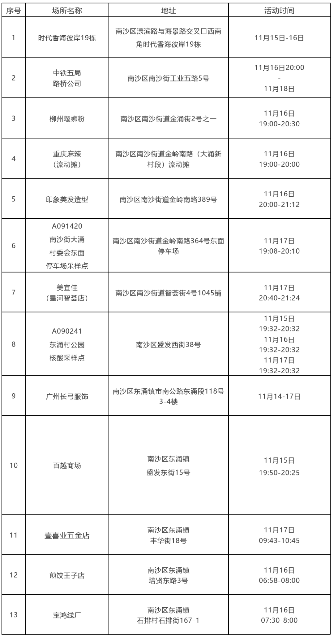•黄埔区:11月18日起对大沙街部分区域实施临时管控;到过鱼珠街、联和街、大沙街涉疫重点场所请立即报备。