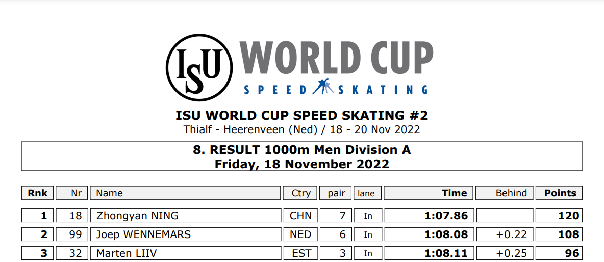 转战芬兰后,宁忠岩更进一步。本站男子1000米是一场“新生力量”之争,宁忠岩在第七组内道出发,3圈过后,以1分07秒86的成绩在20位选手中列第一位。这是宁忠岩职业生涯第四次登上世界杯最高领奖台,同时,他也以96分暂居该项目世界杯积分榜首位。