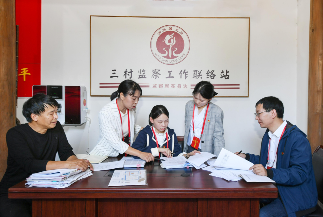 龙泉市纪委监委强化村级财务监督,深入开展“白条抵库”问题整治,严查群众身边的“微腐败”。图为该市纪检监察干部在龙渊街道三村查看村级账目情况。周杰 摄