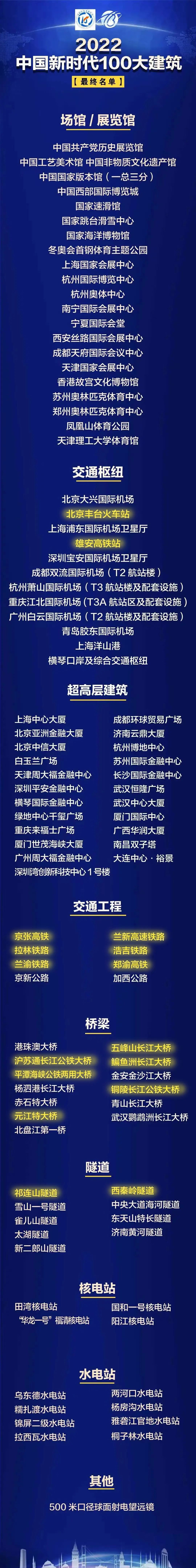 在“2022中国新时代100大建筑 ”榜单中,北京丰台站、雄安站、京张高铁、兰新高铁、拉林铁路、浩吉铁路、兰渝铁路、郑渝高铁、五峰山长江大桥、沪苏通长江公铁大桥、鳊鱼洲长江大桥、平潭海峡公铁大桥、铜陵长江公铁大桥、元江特大桥、祁连山隧道、西秦岭隧道光荣登榜。