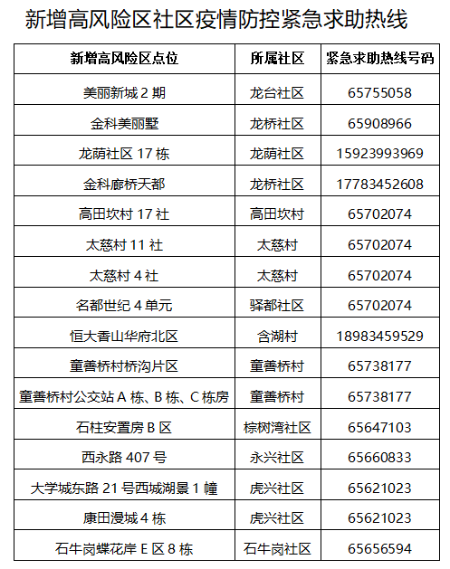 白市驿镇(4个):高田坎村17社(从11月19日8时起算),太慈村11社(从11月19日8时起算),太慈村4社(从11月19日8时起算),名都世纪4单元(从11月19日8时起算)。