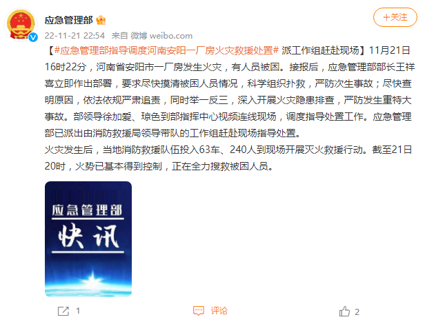 据 @应急管理部 消息,11月21日16时22分,河南省安阳市一厂房发生火灾,有人员被困。接报后,应急管理部部长王祥喜立即作出部署,要求尽快摸清被困人员情况,科学组织扑救,严防次生事故;尽快查明原因,依法依规严肃追责,同时举一反三,深入开展火灾隐患排查,严防发生重特大事故。部领导徐加爱、琼色到部指挥中心视频连线现场,调度指导处置工作。应急管理部已派出由消防救援局领导带队的工作组赶赴现场指导处置。
