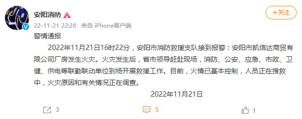 早些时候,@安阳消防 发布消息, 2022年11月21日16时22分,安阳市消防救援支队接到报警:安阳市凯信达商贸有限公司厂房发生火灾。火灾发生后,省市领导赶赴现场,消防、公安、应急、市政、卫健、供电等联勤联动单位到场开展救援工作。目前,火情已基本控制,人员正在搜救中,火灾原因和有关情况正在调查。