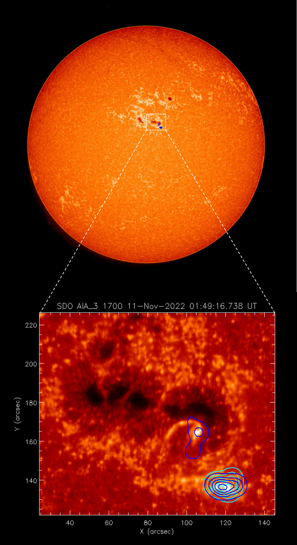 “夸父一号”卫星硬X射线成像仪载荷对太阳耀斑的两能段硬X射线成像(25-30和30-35 keV,等值线)叠加在SDO卫星AIA 1700 Å 图像背景上。