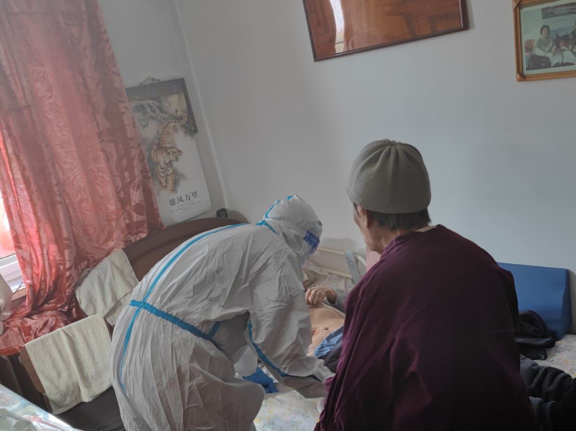 朝阳区垂杨柳医院医生郭春海,下班时间赶到管控区,为一位98岁的老先生换药,帮助他和家人平稳度过管控期。