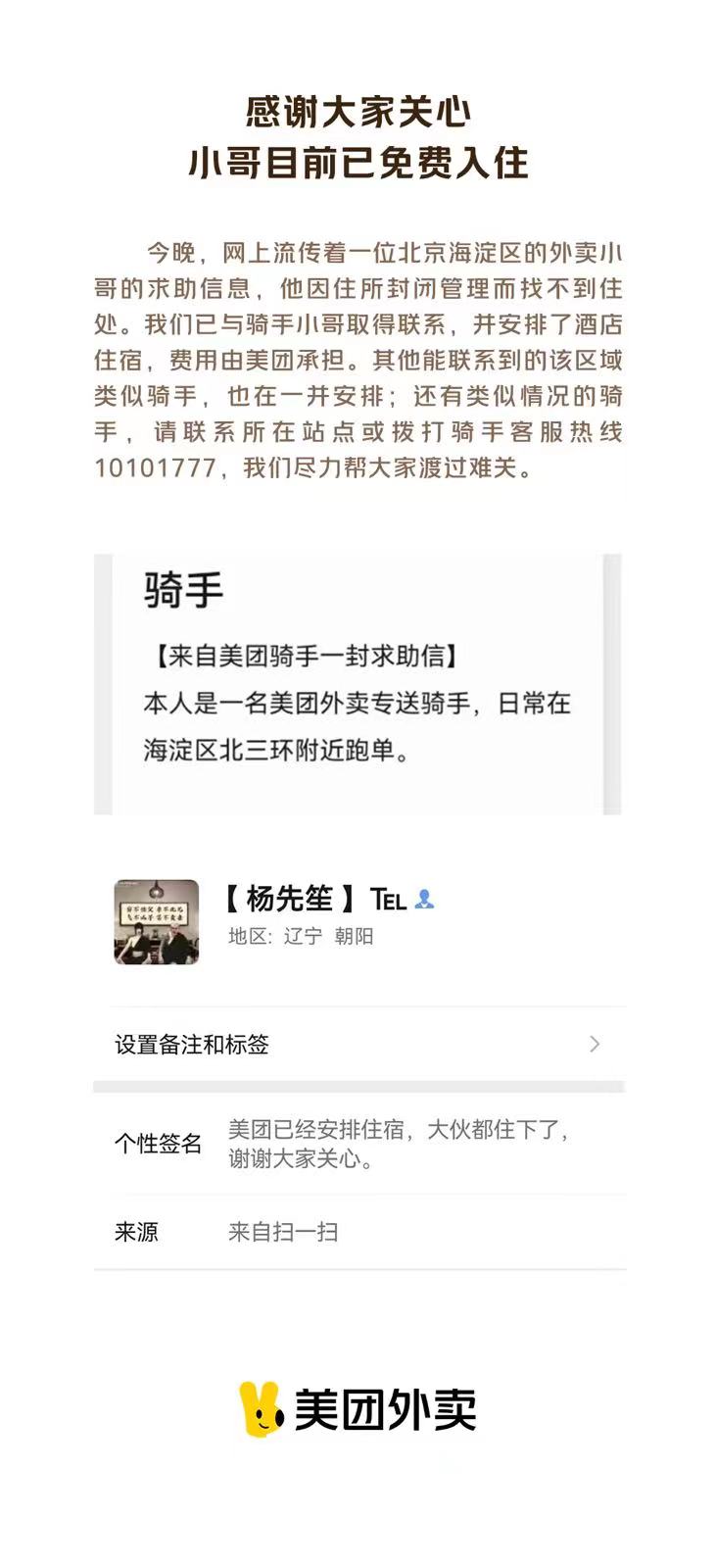 11月22日晚,北京海淀区一名外卖小哥的求助信息在社交平台上广泛流传,该骑手表示,因为住所封闭管理而连续几天找不到住处。记者从美团获悉,平台方已经在当晚与骑手小哥取得联系,并安排了酒店住宿,费用由平台承担。其他能联系到的该区域骑手,也在一并安排。