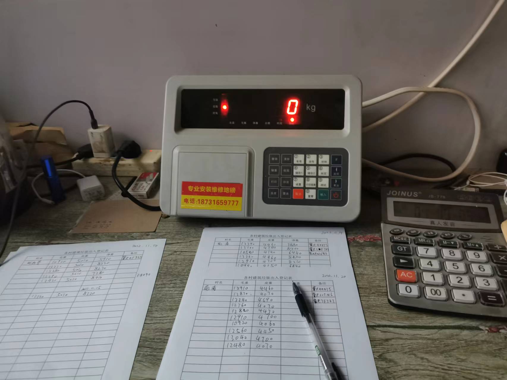 场地北门内铺设着一段钢制通道,细看才发现是一台长长的地磅,车开上去,地磅称重启动,值班室内的电子屏上就会显示出所装建筑垃圾的重量。桌子上还摆着两份登记表,其中一份登记表显示,当日前甫村共有3辆车分10次运入建筑垃圾,另一份表格内填写了每次清运的建筑垃圾毛重、皮重、净重等。