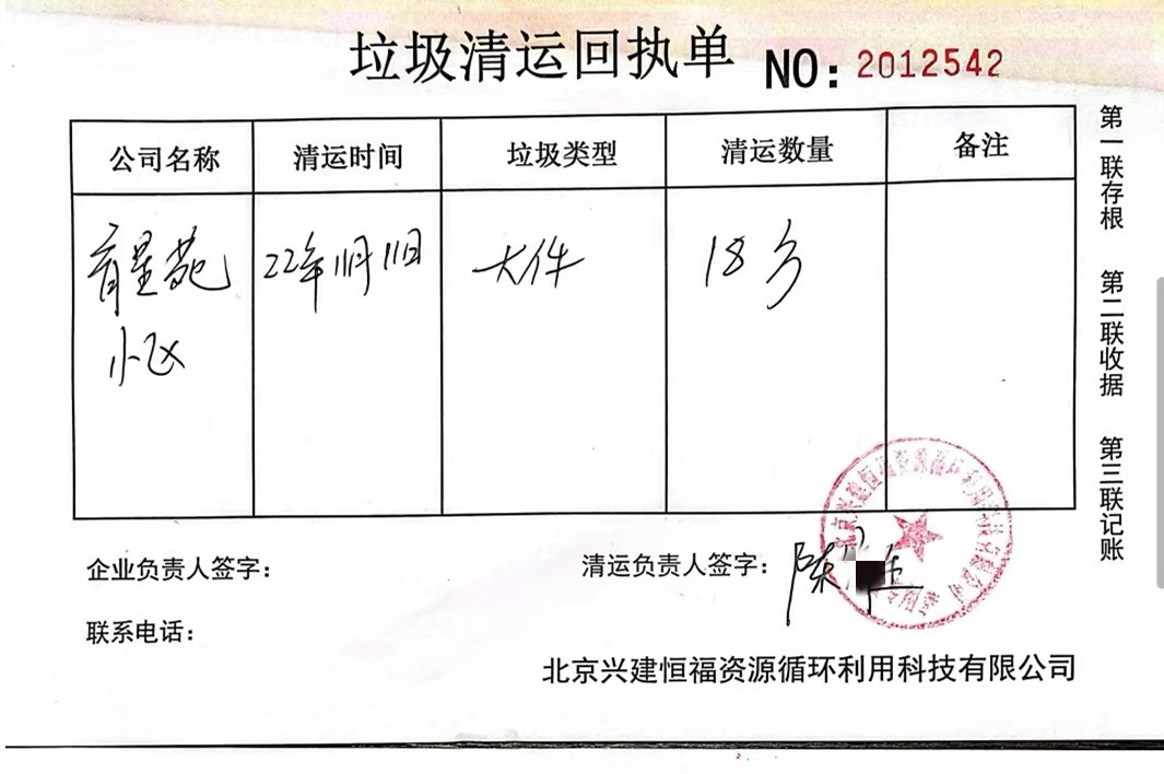 目前,在大兴区采育镇42个行政村及3家社区,建筑垃圾和大件垃圾从产生源头至末端消纳已实现全链条闭环监管。一张盖有村、镇两级公章的“备案单”,不仅是建筑垃圾的“出生证”,更贯穿了其自收集、存放,到运输、消纳的各个环节,且最终形成台账,成为垃圾消纳的结算依据。