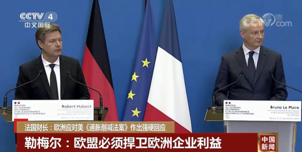 法国财长勒梅尔与德国副总理兼经济和气候保护部长哈贝克22日举行联合新闻记者发布会。勒梅尔表示,法德两国政府一致认为,应该对美国的《通胀削减法案》作出强硬回应,欧盟必须捍卫欧洲人自己的利益。
