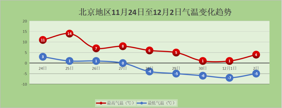 从11月26日(周六)开始,北京气温骤降,冷成为天气的主流。南郊观象台11月24日到12月2日最高气温1℃~14℃,最低气温-7℃~3℃。