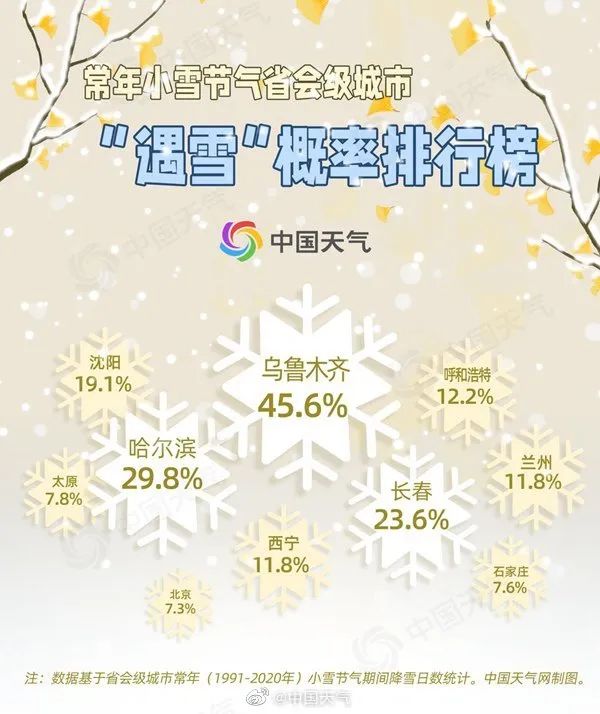 进入小雪节气,今冬初雪会来吗?中国天气网气象分析师石妍介绍,常年,华北、黄淮一带会在小雪节气期间迎来初雪。经统计1991年至2020年省会级城市的降雪数据,小雪节气期间,北京“遇雪”概率为7.3%。
